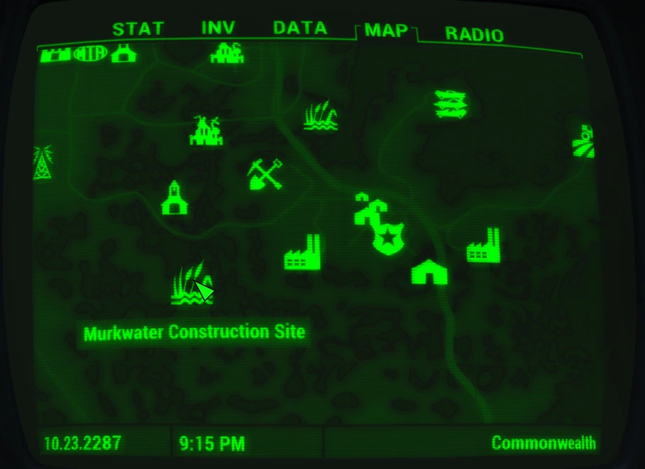 Despite the abundance of marshland south of Hyde Park, construction had begun on the outskirts of this area before the bombs dropped. Venture farther into the swamp to uncover some secondary locations. Currently, this area is teeming with wildlife of the irradiated and pincer-snapping kind. If made safe, this could be an excellent settlement location."