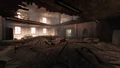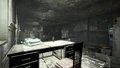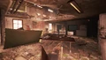 A small open hallway leads from the recruitment office to the barracks; the entrance hallway is blocked by a collapsed floor, forcing one up the adjacent staircase to the second story. The immediate left leads to some offices, and continuing straight ahead, there is a storeroom to the left and the sleeping quarters and showers/lavatories to the right (both rooms have collapsed floors leading back to the ground level). The ground floor below hosts the kitchen and mess hall, and has a door on the far south wall that leads outside to a security gate.