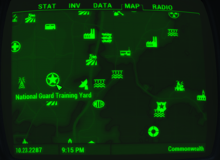 Two hundred years ago, the National Guard was in higher demand than ever before. This facility was expanded just prior to the bombs falling. Currently, this location has recently been visited by the Brotherhood of Steel; they used this location to house and repair Power Armor."