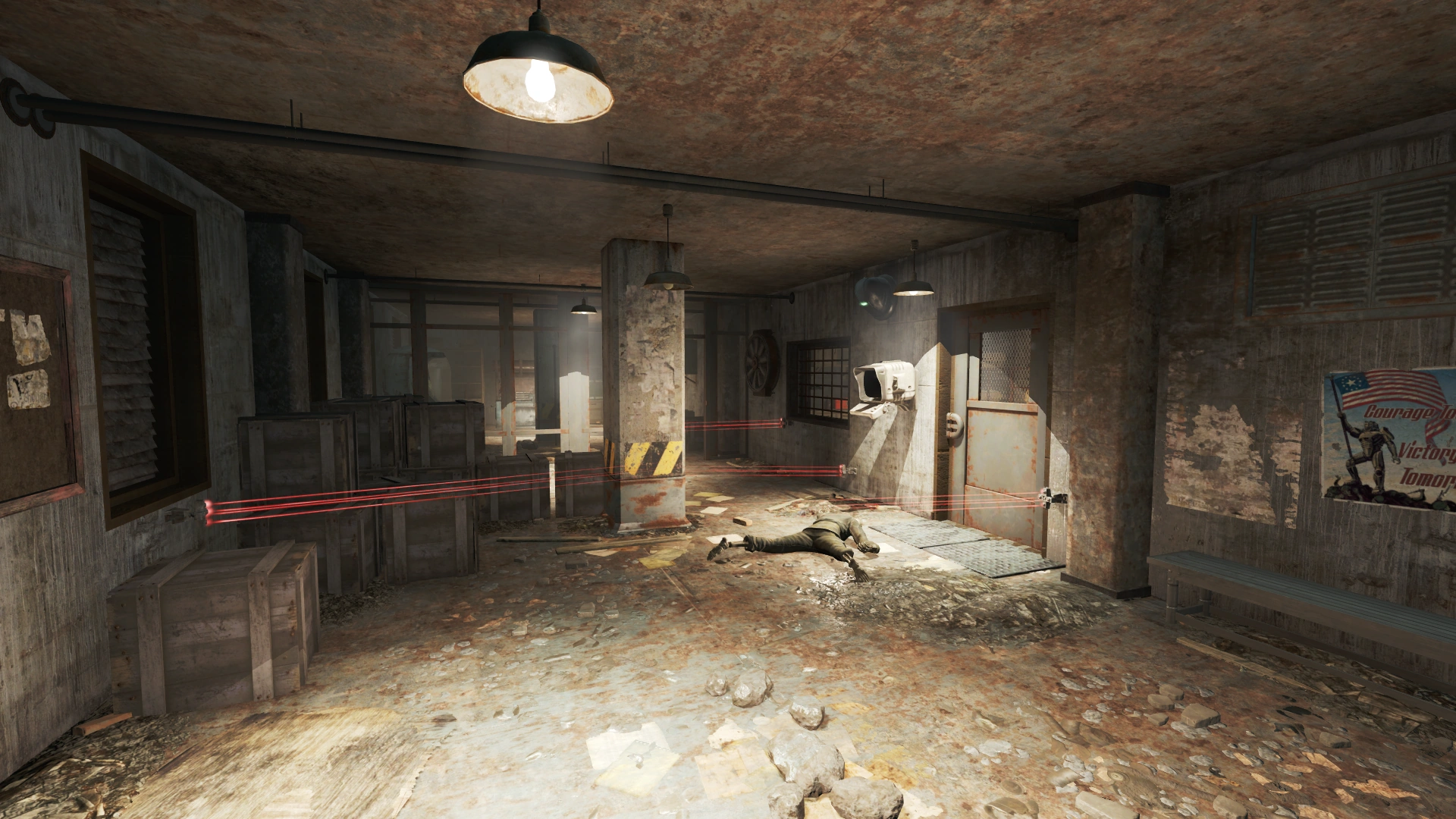 Locked with a Master-level lock, the armory west-northwest of the barracks and recruitment office. The entrance room is protected by laser tripwires. To the west is a small workshop containing an armor and weapons workbench as well as a trunk; to the north is a power armor storage room (opened with a Novice-locked terminal), which contains a power armor frame and partial suit of leveled power armor.
