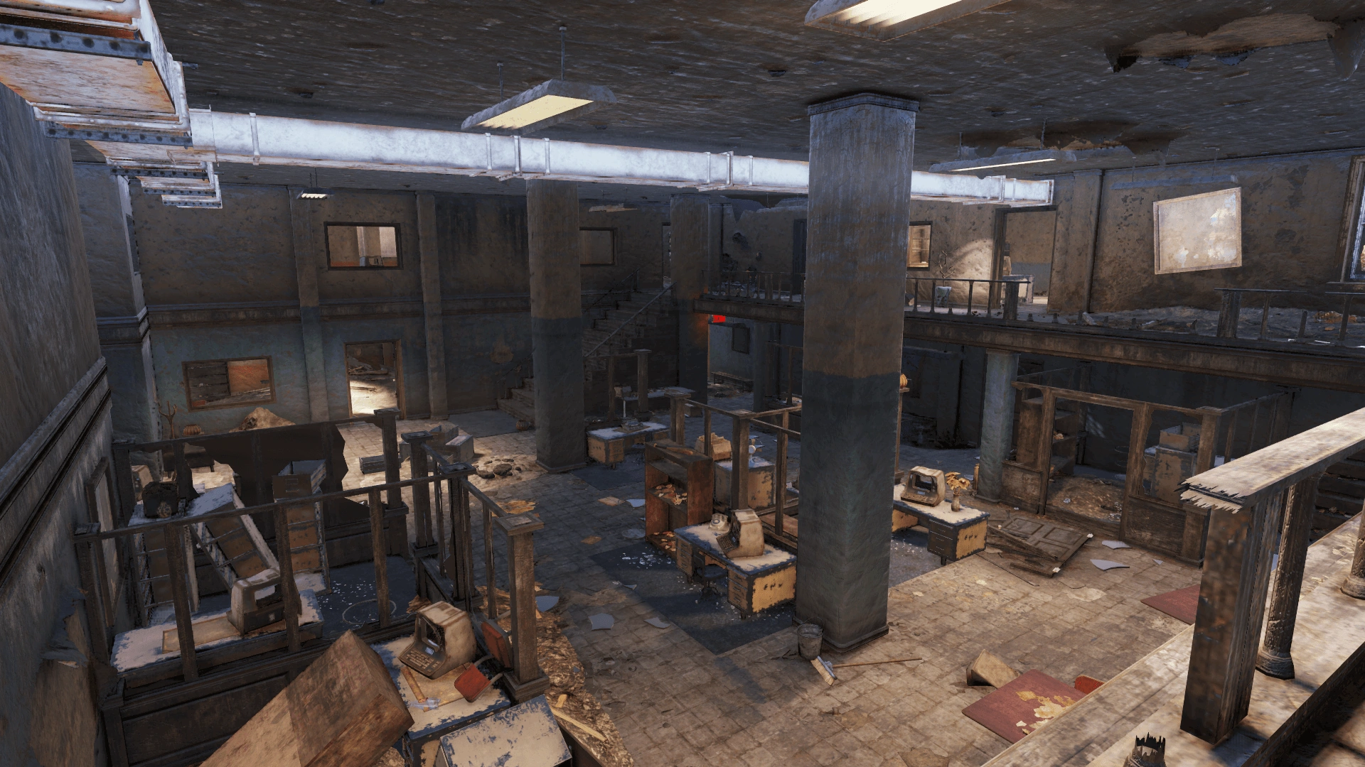 The office building to the southeast contained offices for the employees and researchers. It's a place with a plethora of phones to collect, two magazine spawns int he offices, and a bobblehead in the northern end. The stairwell in the northeast leads to the basement and a laboratory with the location's steamer trunk and override terminal.
