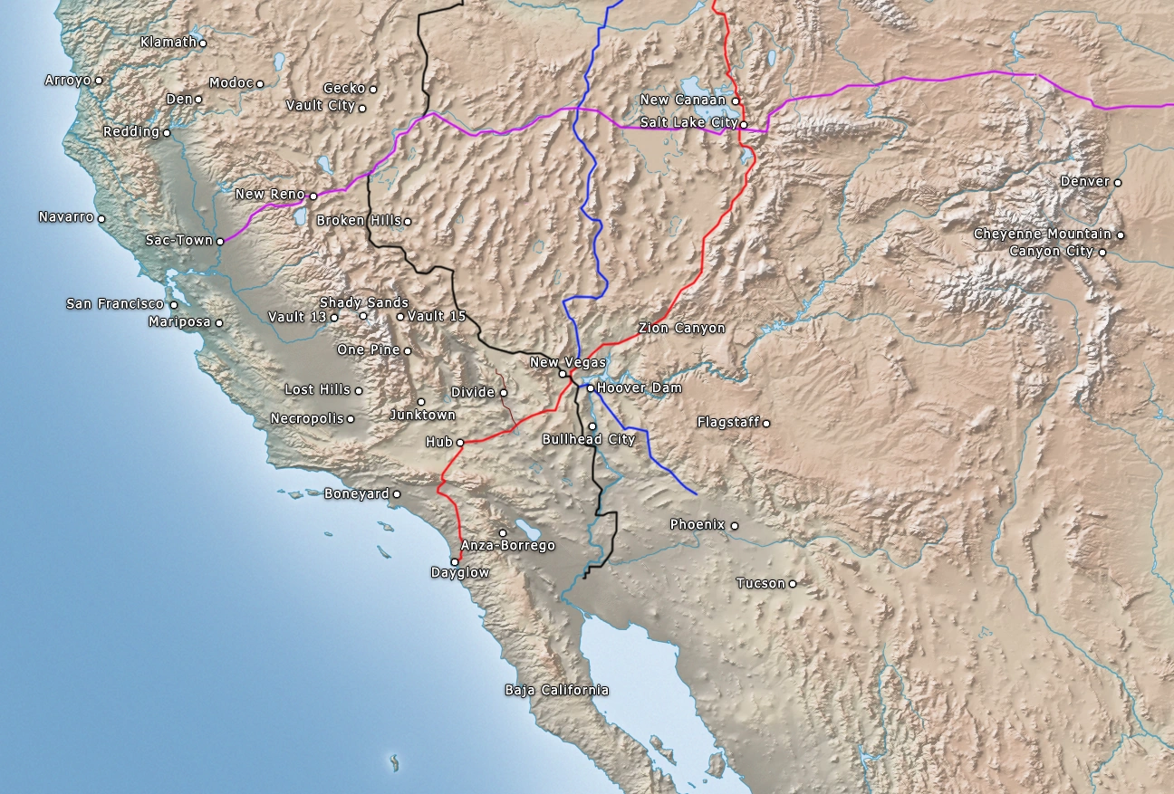Physical map of New California and neighboring eastern territories (does not include post-2077 geographic changes to the coastline). Major extant roads are marked: I-15 (red), I-80 (violet), Highway 95 (black), and Highway 93 (blue)[86]