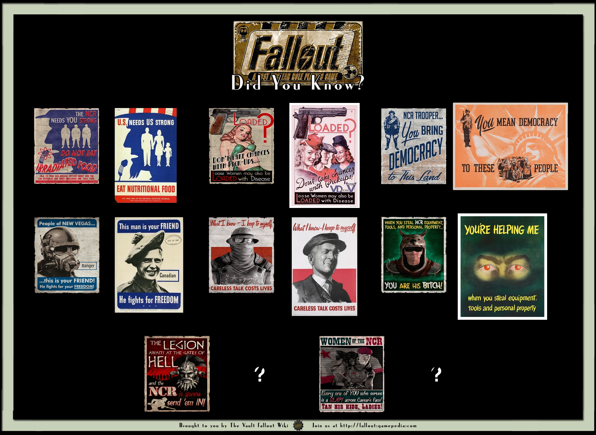 ↑Fallout: New Vegas loading screen hints: "The NCR's military doesn't like being in the role of "peace-keeper". Crimes across the Mojave are typically punished by death."