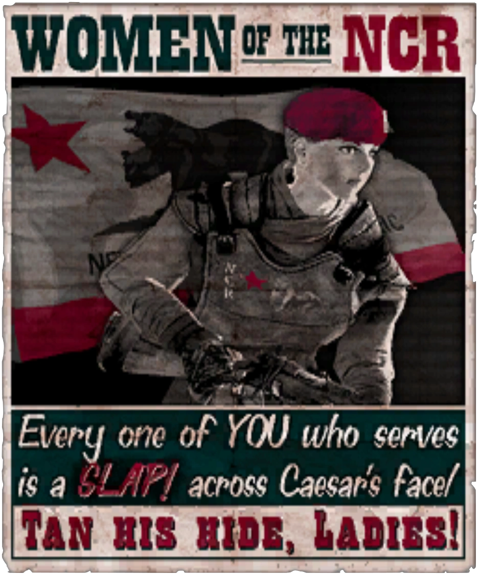 ↑The Courier: "What do you think of the NCR?" Caesar: "Do you want my opinion as a former citizen, or future conqueror? Actually, my opinion's the same either way. As a young man I was taught to venerate President Tandi of Shady Sands. "The Founding Mother of the New California Republic." Did you know her Presidency lasted 52 years? And that her father, Aradesh, was the Republic's first President? Does that sound like democracy to you, or a hereditary dictatorship?" The Courier: "President Tandi was voted into office each time." Caesar: "Because the council didn't dare oppose her. She was too popular. She had the people's love. So things ran smoothly, more or less. And as soon as she was gone, as soon as there really could be "democracy" - what happened then? Ever since losing its queen, the NCR has been weaker, more diffuse. Democracy has been its weakness, not its strength." The Courier: "How is the NCR weak?" Caesar: "Greed runs rampant. The government is corrupt, accepting bribes from Brahmin barons and landowners, to the detriment of citizens. The NCR is a loose conglomerate of individuals looking out for themselves. It's lost virtue. No one cares about the collective, the greater good. It's not built to last. I'm just hastening the inevitable." The Courier: "Surely, the NCR is a powerful foe?" Caesar: "Of course. The most powerful my Legion has faced. Also the first to which I am ideologically opposed. Until now, every tribe I've conquered has been so backwards and stunted, enslavement has been a gift bestowed upon them. My conquest of the Mojave will be a glorious triumph, marking the transition of the Legion from a basically nomadic tribe to a genuine empire. Just as my namesake campaigned in Gaul before he crossed the Rubicon, so have I campaigned, and will cross the Colorado." (Caesar's dialogue)