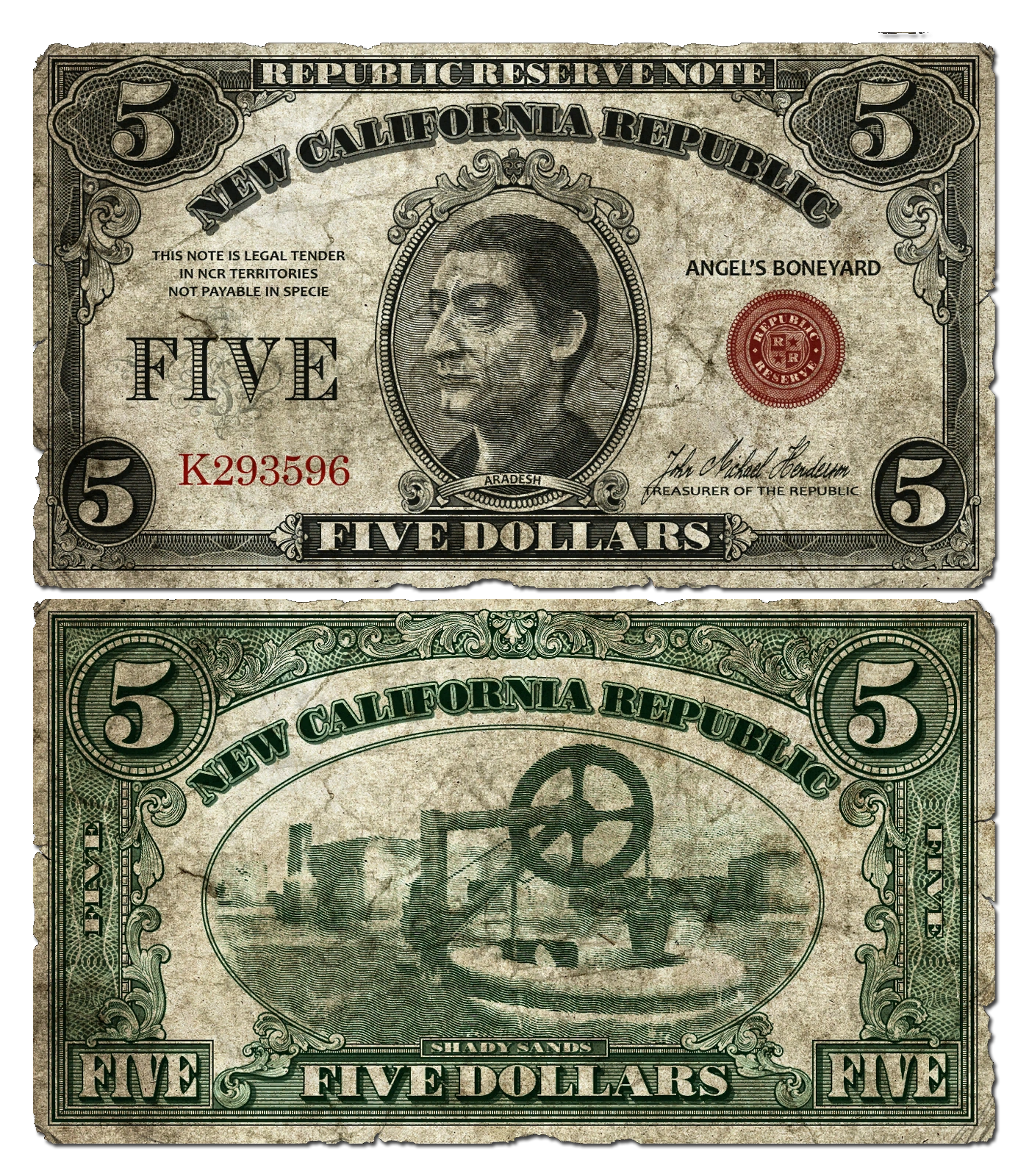 By 2281, the NCR dollar is valued at about 40% of a water-backed cap[25] and only 10% of a silver Legion denarius. In the Mojave Wasteland, these notes can be seen in the $5, $20, and $100 denominations. The notes are issued by the Republic Reserve Bank located in Angel's Boneyard. In 2281, the current Treasurer of the Republic and head of the NCR Treasury is John Michael Henderton; his signature can be found on the front face of all NCR notes found in the Mojave Wasteland.[26]