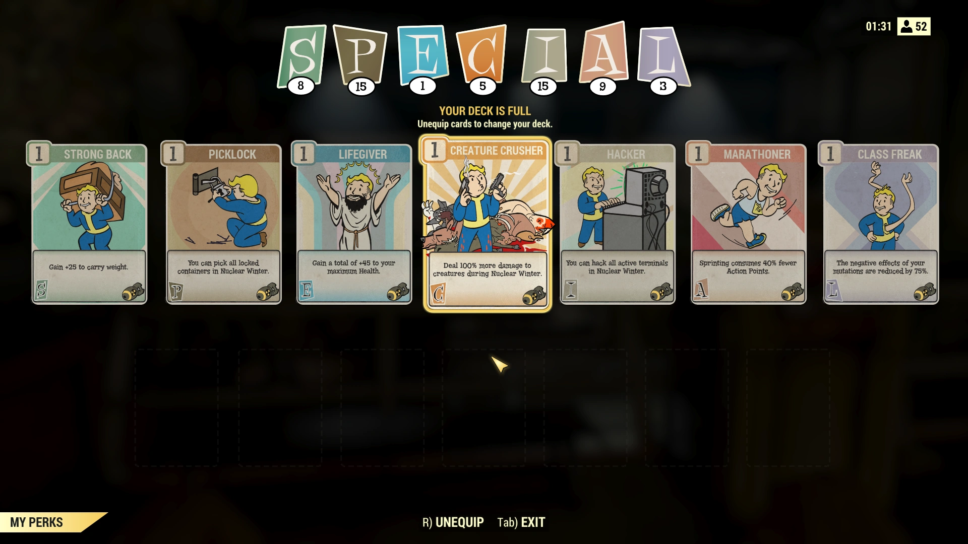 This page covers perks available in Nuclear Winter. Unlike the base game, all perks come in a single, top level grade. Packs received on Overseer level up also provide a single perk card, as opposed to five in the regular game.