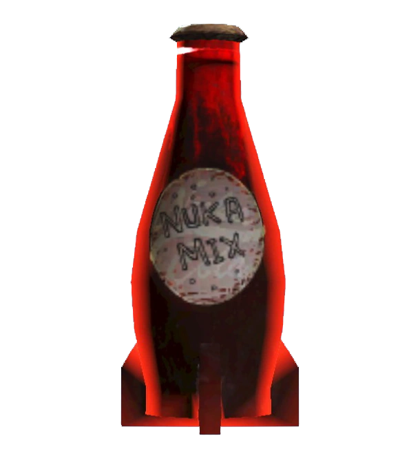 The mixture of Nuka-Colas that make this dark-red, sugary punch consists of Nuka-Cola Quartz blended with the fruit flavors of Nuka-Cherry, Nuka-Cola Orange, and Nuka-Grape. It provides 100 hit points, 50 action points, increases maximum hit points and action points by 30 and 10, respectively, and removes 500 rads.