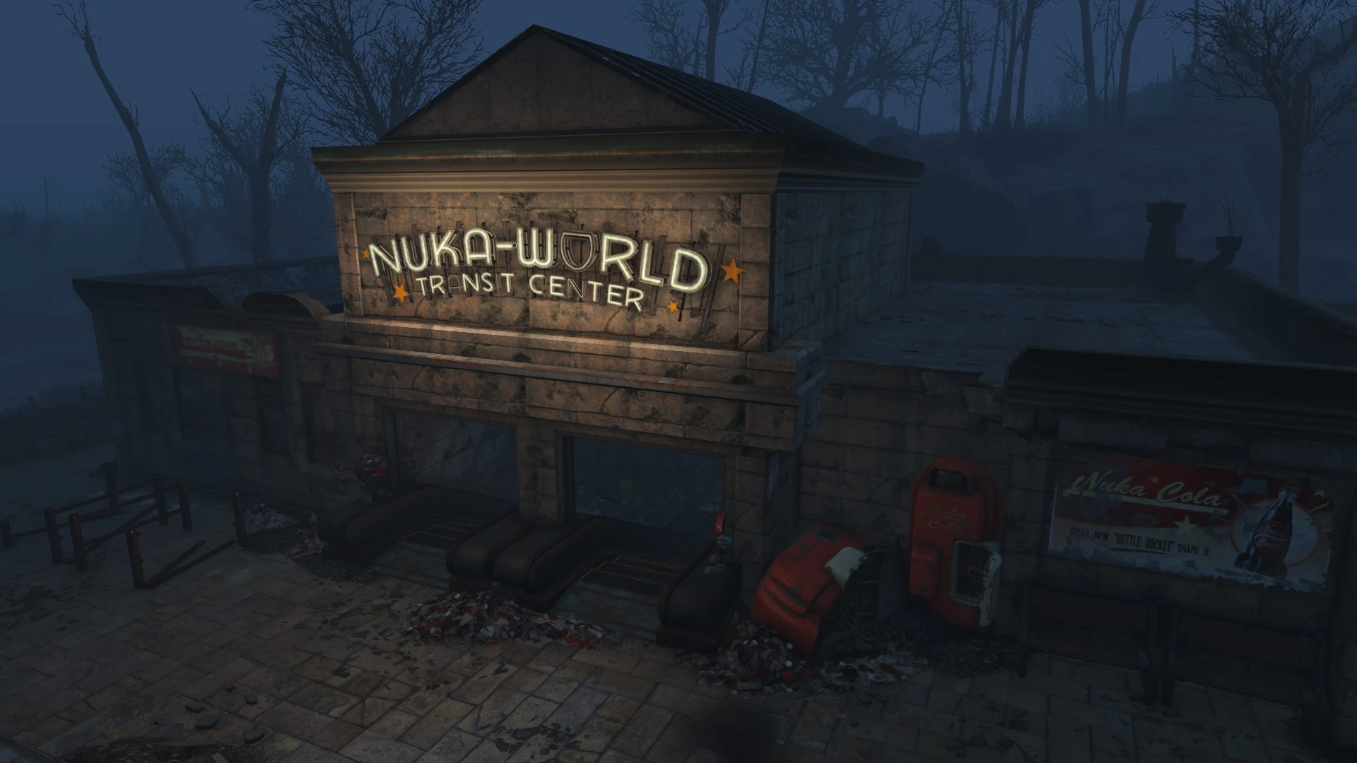 The Nuka-World Transit Center is a seemingly abandoned Metro hub just off the highway west of the Greater Boston Area.