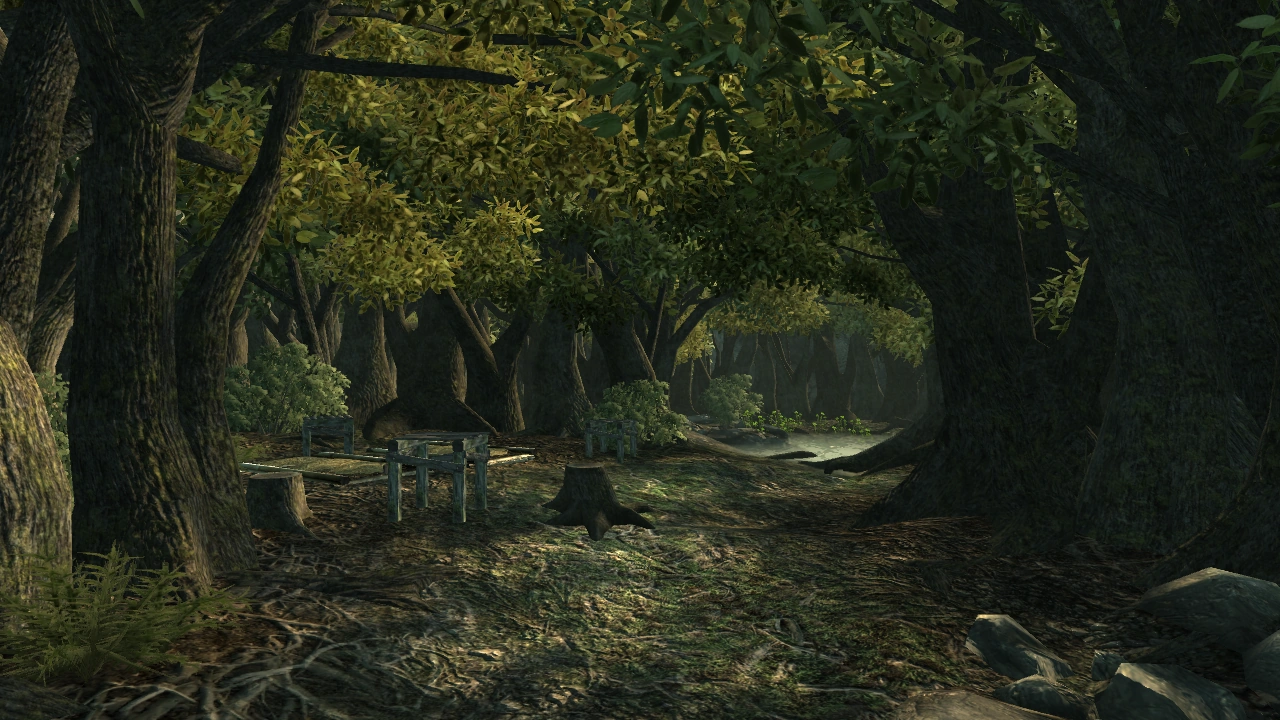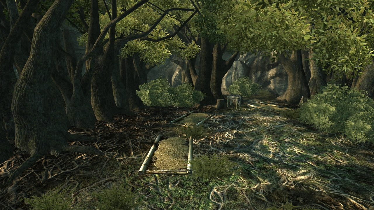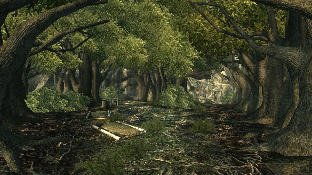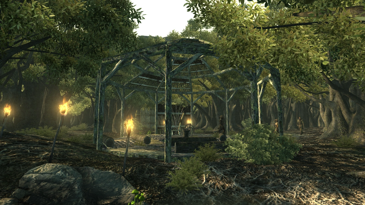 The Oasis itself is a small vale located inside the rock formation. It's a small area, centered around a makeshift pavilion with the basin of purification. Scattered inside alcoves created by the rocks and trees are resting places for the Treeminders.
