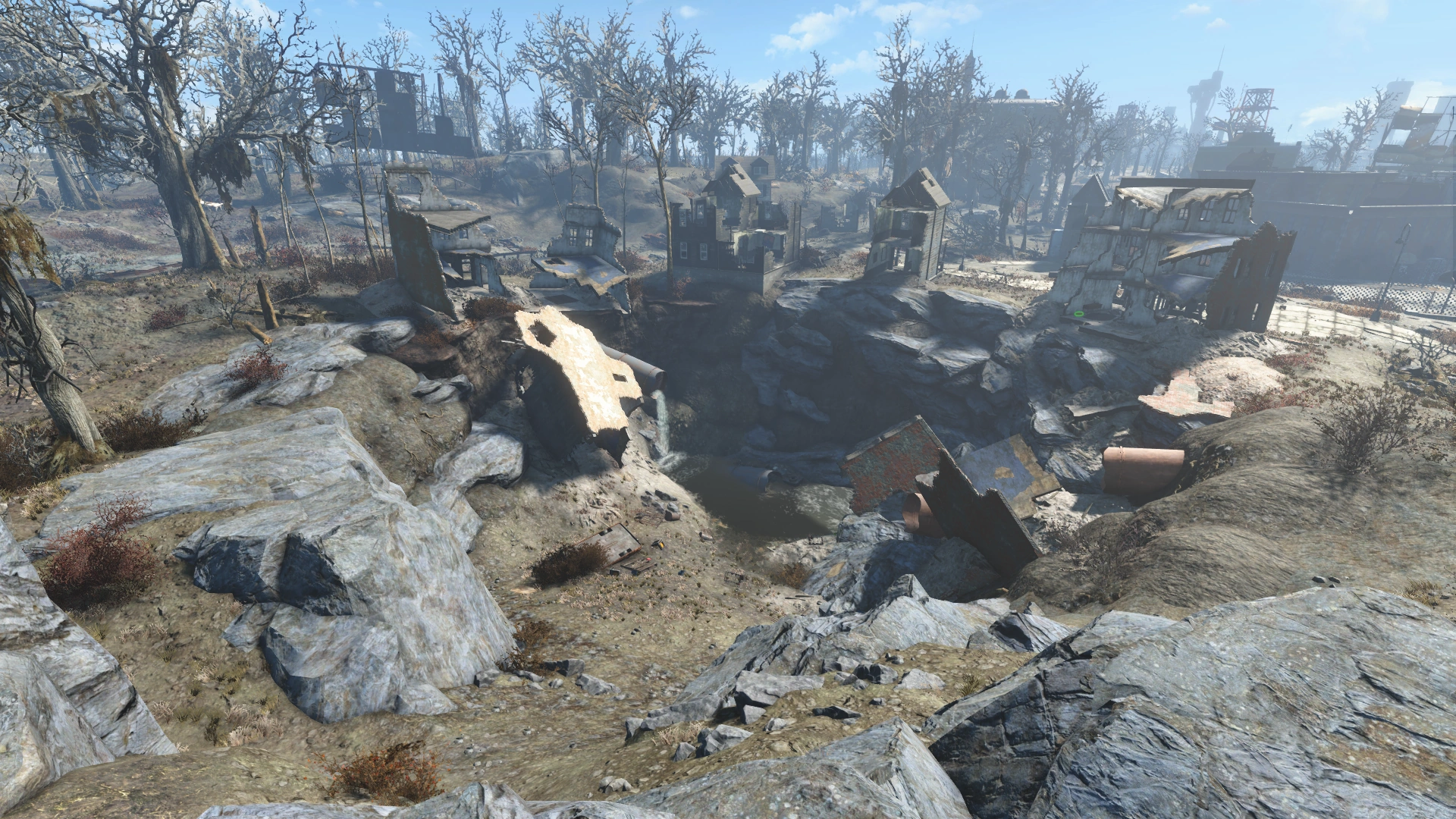 Flanked by some collapsed houses on the south, the sinkhole slopes down to the deathclaw's den, next to the artificial stream created by a severed storm drainage pipe. The stream drops further down the sinkhole into a cave.