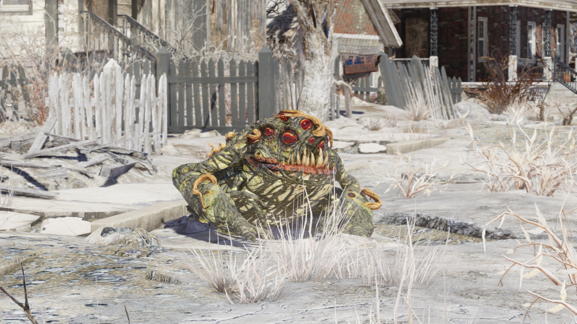 Twisted by the Appalachian nuclear fallout, the toads of West Virginia got big and vicious. Radtoads use their elongated tongues to ambush prey at a distance, with the multiple working eyes providing excellent peripheral vision. If attacked, they unleash clouds of poison gas from the twisted parotoid glands and send out swarms of their own offspring to harass opponents.<ref>Fallout 76 loading screen hints