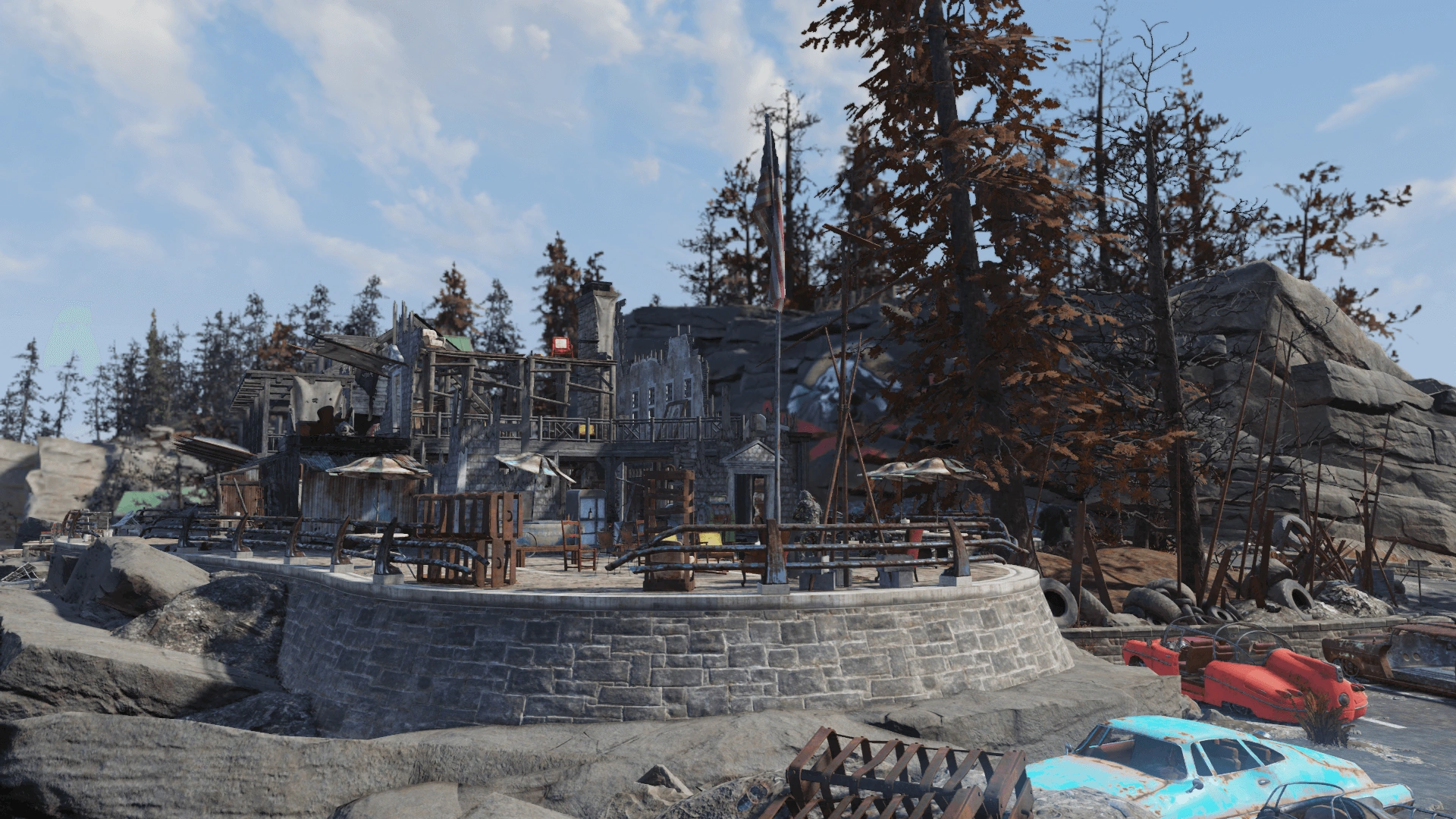 - The cabins stretch on the northern slope of the mountain, surrounding the meandering main road. The northwestern cluster is perhaps the most rich in potential loot, as it contains two safes in the northwestern cabins, together with a magazine spawn point and a chemistry station just the opposite, together with remnants of the raiders' trading post and bar. There's also the arena, with a random raider power armor in the center, surrounded by raider bodies, with the adjacent chalet that served as a viewing station containing armor workbenches and another magazine spawn point. There are random plans by the workbenches themselves, on the shelves.