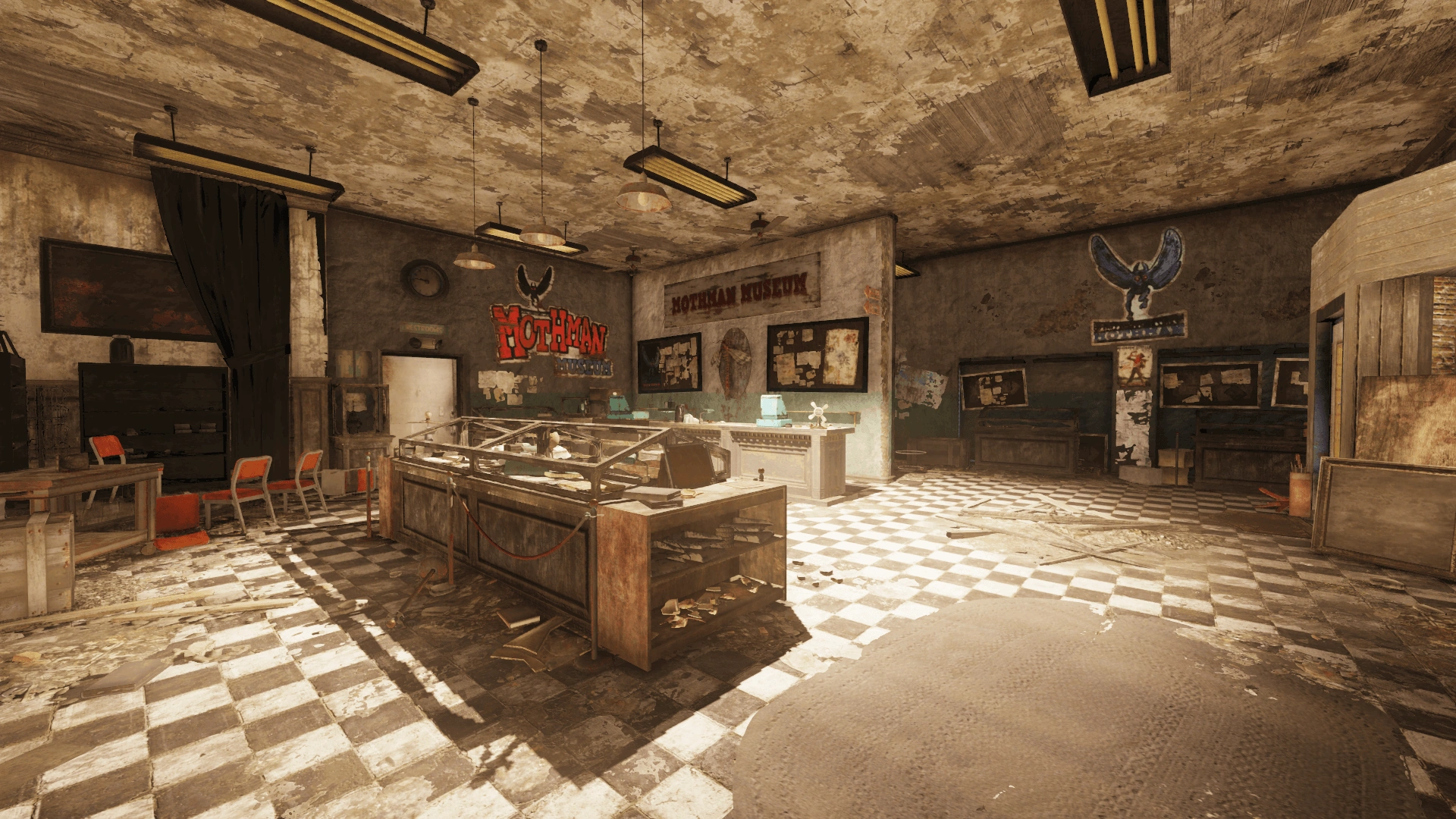 - The primary attraction downtown is the Mothman Museum and the accessible apartment block across the street. The Museum's front doors have to be picked open, otherwise players will have to go around the building and enter via the upper floor, which has a tinker's workbench. The usual museum loot downstairs belies a more interesting find: Through the bathroom, players can access the cultist chapel, which is... Disturbing to behold. The fact that the candles are still lit is even more disturbing. The ritual bindings can be found within.