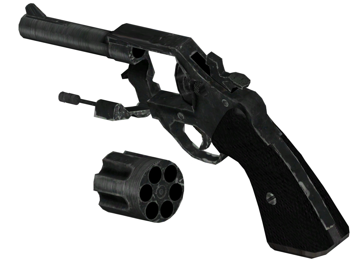 The police pistol is a double-action .357 revolver with a swing-out cylinder similar to that of a .44 magnum revolver instead of a loading gate like the .357 magnum revolver. Though it is a double-action, it is fired by the Courier in single-action form with the hammer being cocked back after each shot to increase accuracy.[1] In comparison to the .357 magnum, it features a shorter barrel and a worn matte black finish. It also lacks rear sights and has a shorter hammer with a flat, textured spur as opposed to the smooth, rounded spur of the .357 magnum revolver.