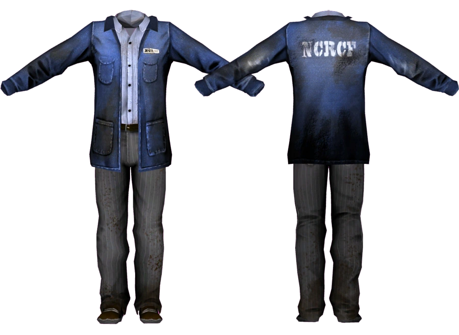 It is the standard NCR Correctional Facility prisoner uniform. It consists of a pair of black pants, a white shirt and a blue jacket. The prisoner's number is stitched on the left-hand breast pocket and "NCRCF" is stitched on the back in white, which is rather faded and appears to have been added later to the jacket, as it is at a slight angle.