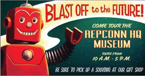 (Tour guide's dialogue) - ↑ Tour guide: "Ready for the REPCONN tour, Rocketeers? Courtesy of the fine folks at RobCo, I'll be your guide today on the path of... Scientific. Discovery. In the lead-lined case behind me is a spent radioactive rod from of our old reactors. No need to stand too close, let's move along, shall we? Look here - a row of multi-colored plasma fuels! Careful, they may look safe to drink, but your stomach is the last place they should be. Why the difference in cylinder size? Refining our production methods has resulted in higher yields of fuel over time, that's why! To my right you can see a sample of some old "safety barrels" REPCONN once used to store radioactive waste. Perfectly safe. On my left is an example of a mountain of REPCONN safety barrels some legislators claim are poisoning our environment. Ridiculous. Behind me is our most recent rocket project, which we're keeping under our hats... until "launch," if you'll pardon the expression. And in front of me is a model - not actual size - of the launch dome we are using to send our rockets screeeeaming into orbit. Now these colorful fellows behind me are REPCONN's earliest... experiments in flight. Feel free to read the plaques and learn, Rocketeers! Now for the highlight of our tour! Due to a generous donation from RobCo, this next exhibit showcases the wondrous world of - robots! Around you are the incredible Eyebot, the fearsome Sentry Bot, and the always-helpful Mr. Handy. That helpfulness runs through our whole line! This is the final stop on our tour. This model of our solar system is a small example of where the partnership between RobCo and REPCONN hopes to go. See those little rockets zipping about? They are manned by robots, tirelessly looking for resources to mine on planets beyond our own. And that's it for our tour today, Rocketeers - RobCo and its tiny partner REPCONN thank you! Any further questions, please, feel free to ask."