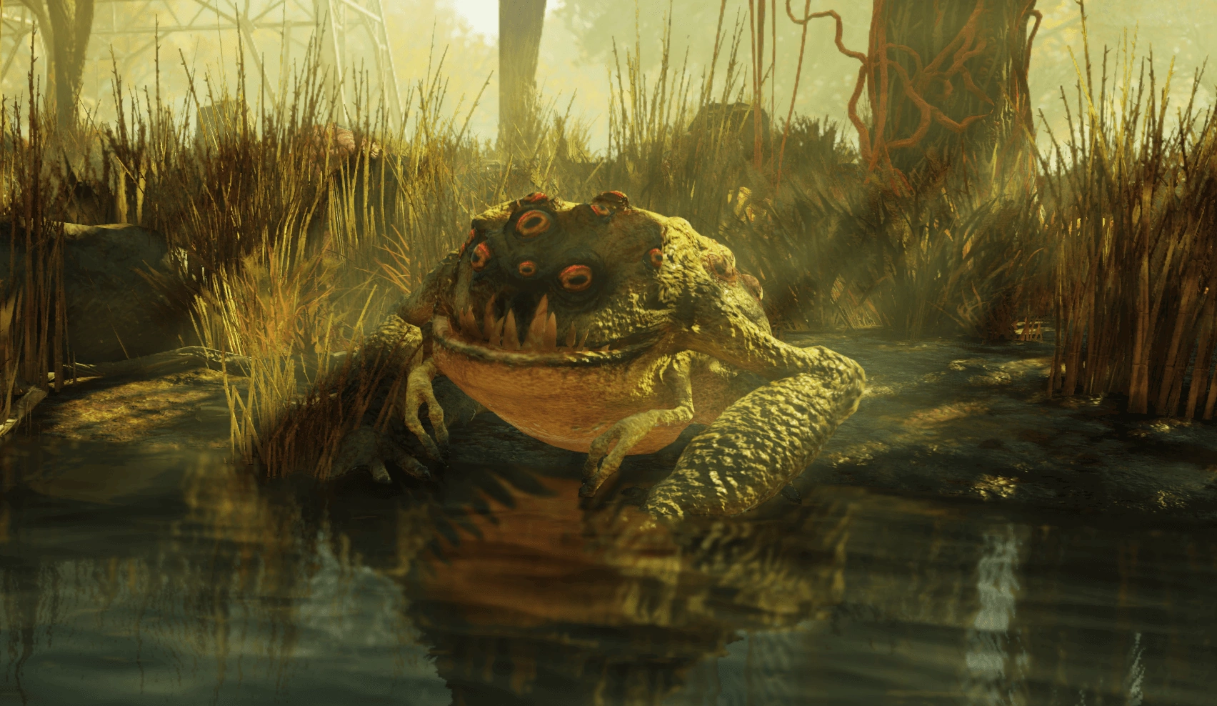 Twisted by the Appalachian nuclear fallout, the toads of West Virginia got big and vicious. Radtoads use their elongated tongues to ambush prey at a distance, with the multiple working eyes providing excellent peripheral vision. If attacked, they unleash clouds of poison gas from the twisted parotoid glands and send out swarms of their own offspring to harass opponents.<ref>Fallout 76 loading screen hints