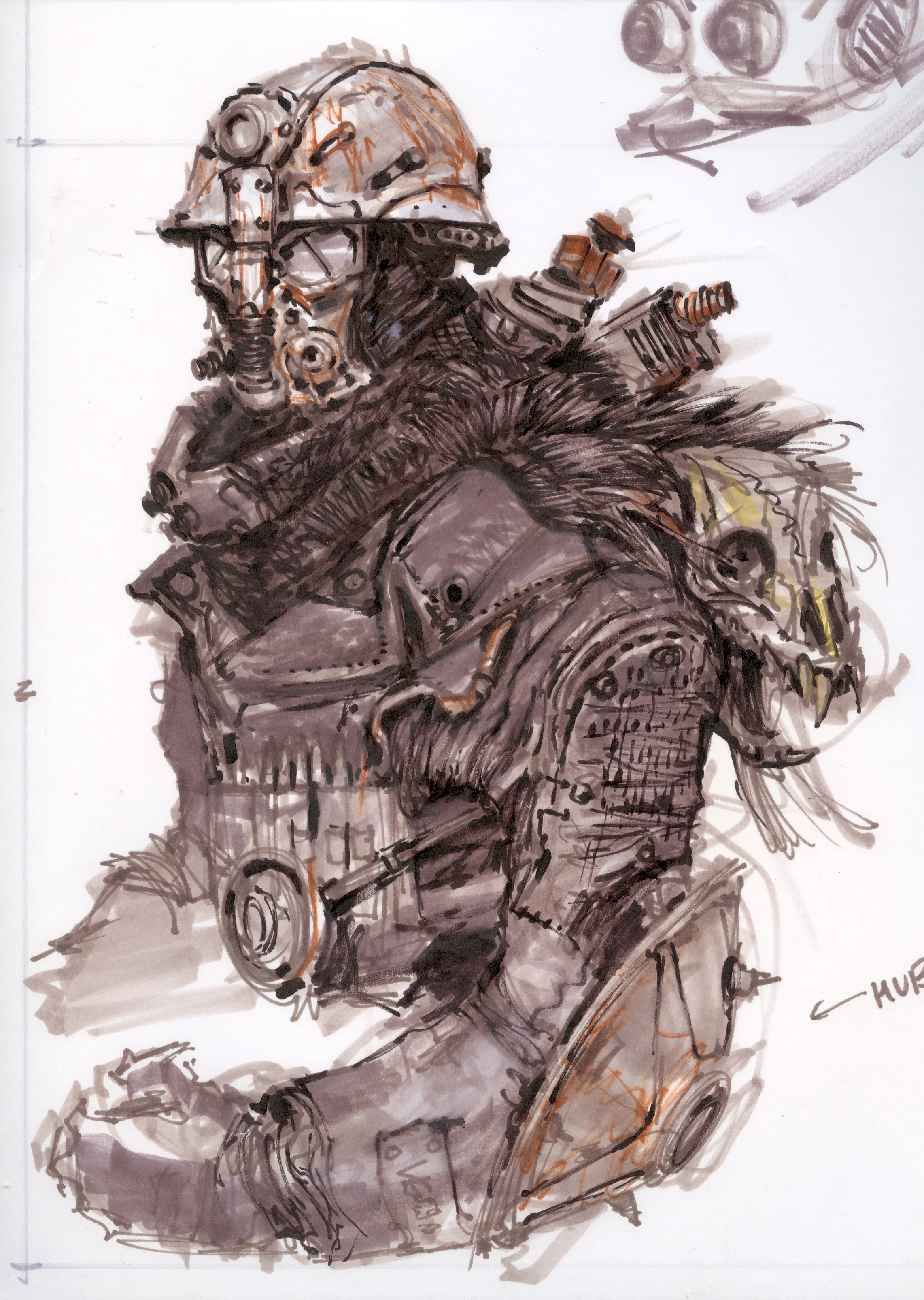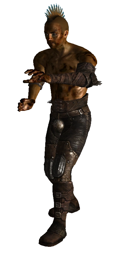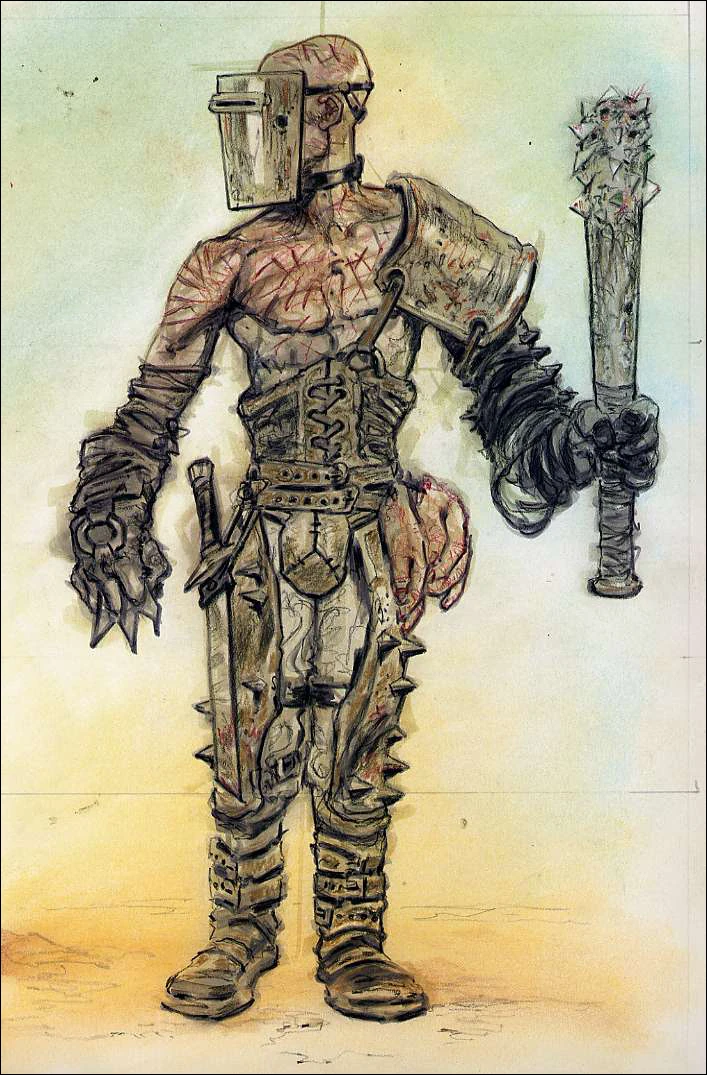 The sadist armor consists of a corselet or bodice of stiff brown leather and studded trousers, with long leather gloves covering the arms, ending slightly below the shoulder. An armored pad is worn on the left shoulder, while the other is bare. Raider sadists usually carry two severed human hands as trophies, hanging them dwon from the hip.