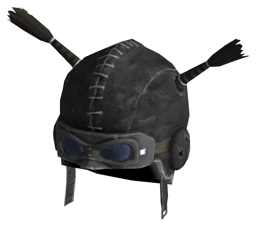 The raider psycho-tic helmet is a vintage football cap/pilot hat, used by raiders as makeshift protection.