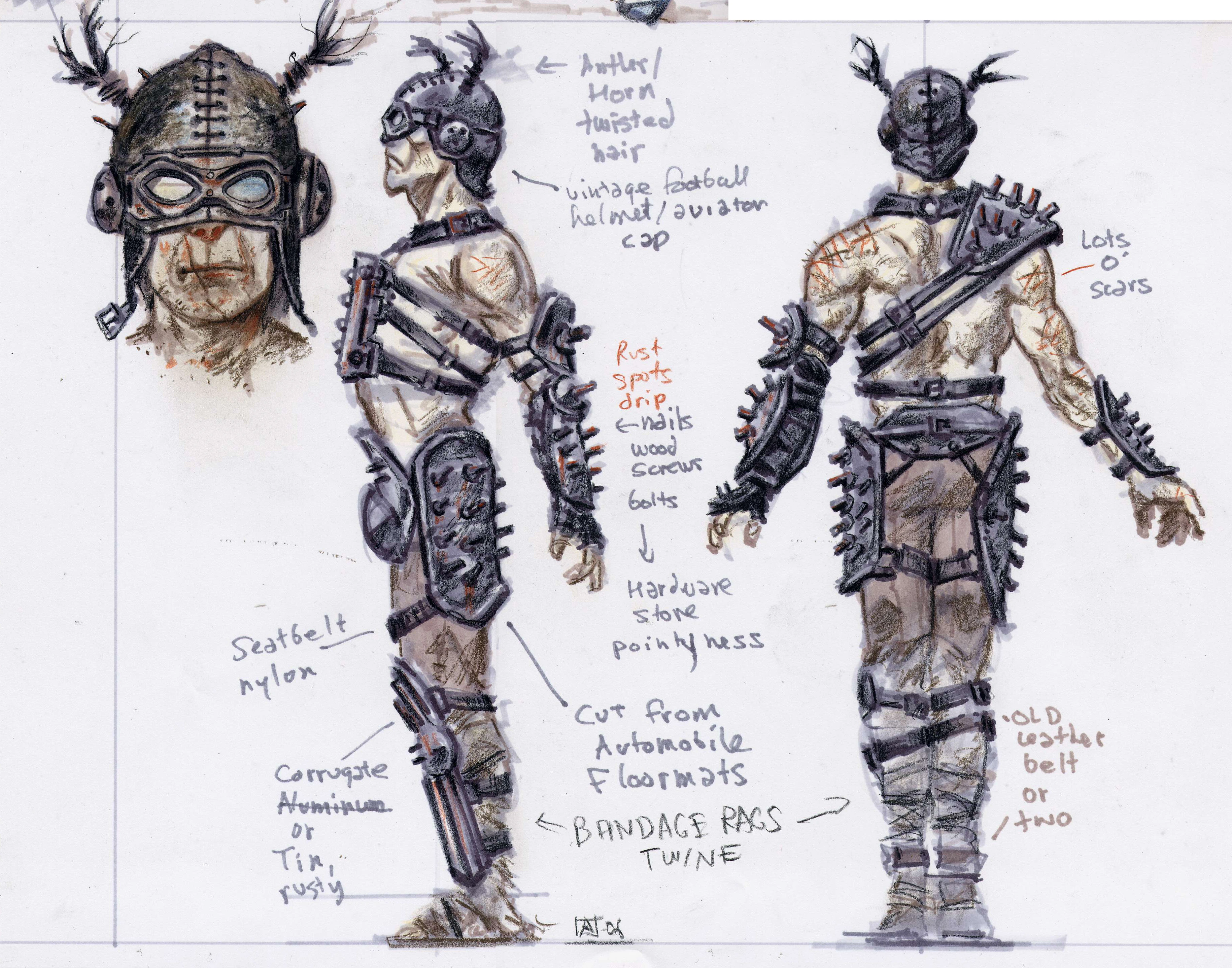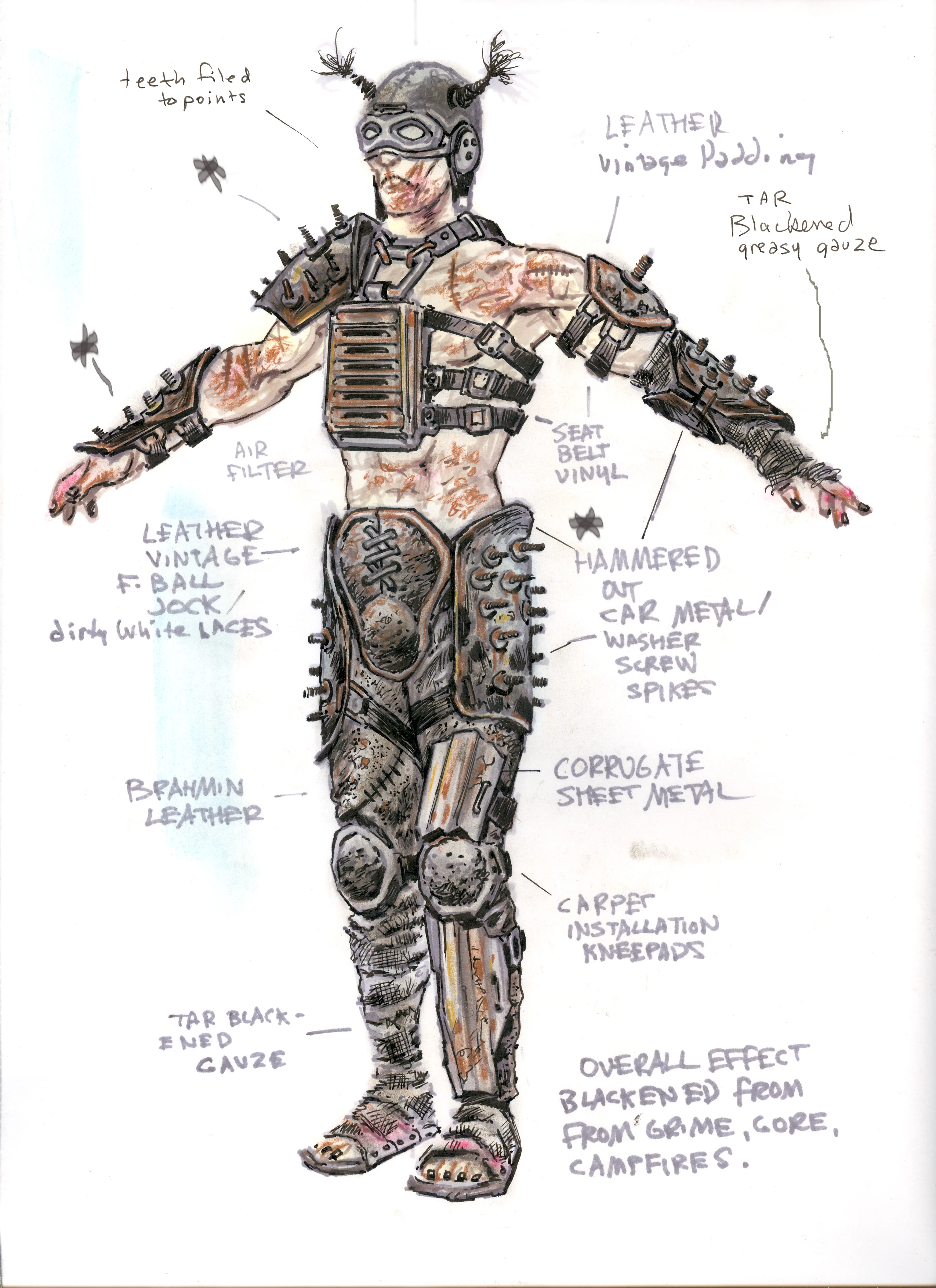 This suit of armor has been cobbled together from salvaged car parts and elements of vintage football gear. The spiked plates protecting the shoulder and thighs are in reality automobile floor mats, with rusty nails and wood screws driven through them to deter attackers. Limbs are protected by fragments of corrugated aluminium held together by nylon seatbelts, while the torso is barely covered by a salvaged metal grill. This rather random assortment of defensive elements is complemented by a football groin protector and two carpet installation kneepads. The suit is typically worn with a raider psycho-tic helmet.