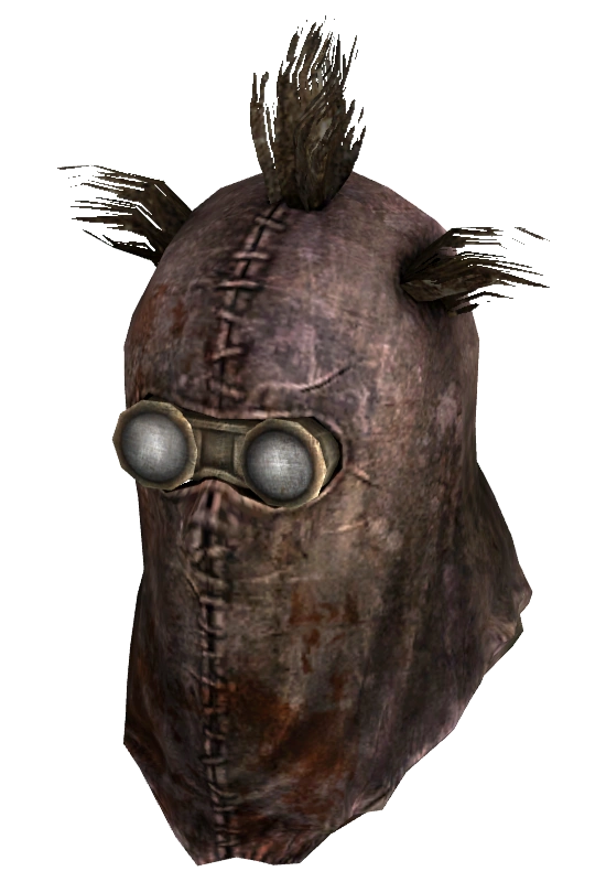 Wastehound "helmet" is sown from two pieces of heavy burlap crudely stitched together around a pair of desert goggles. Raiders typically pull strands of their hair out through openings in the burlap to create a more menacing appearance. Males typically create three tufts (two on the sides, one on top), while females create a makeshift mohawk by pulling hair out through the stitching.