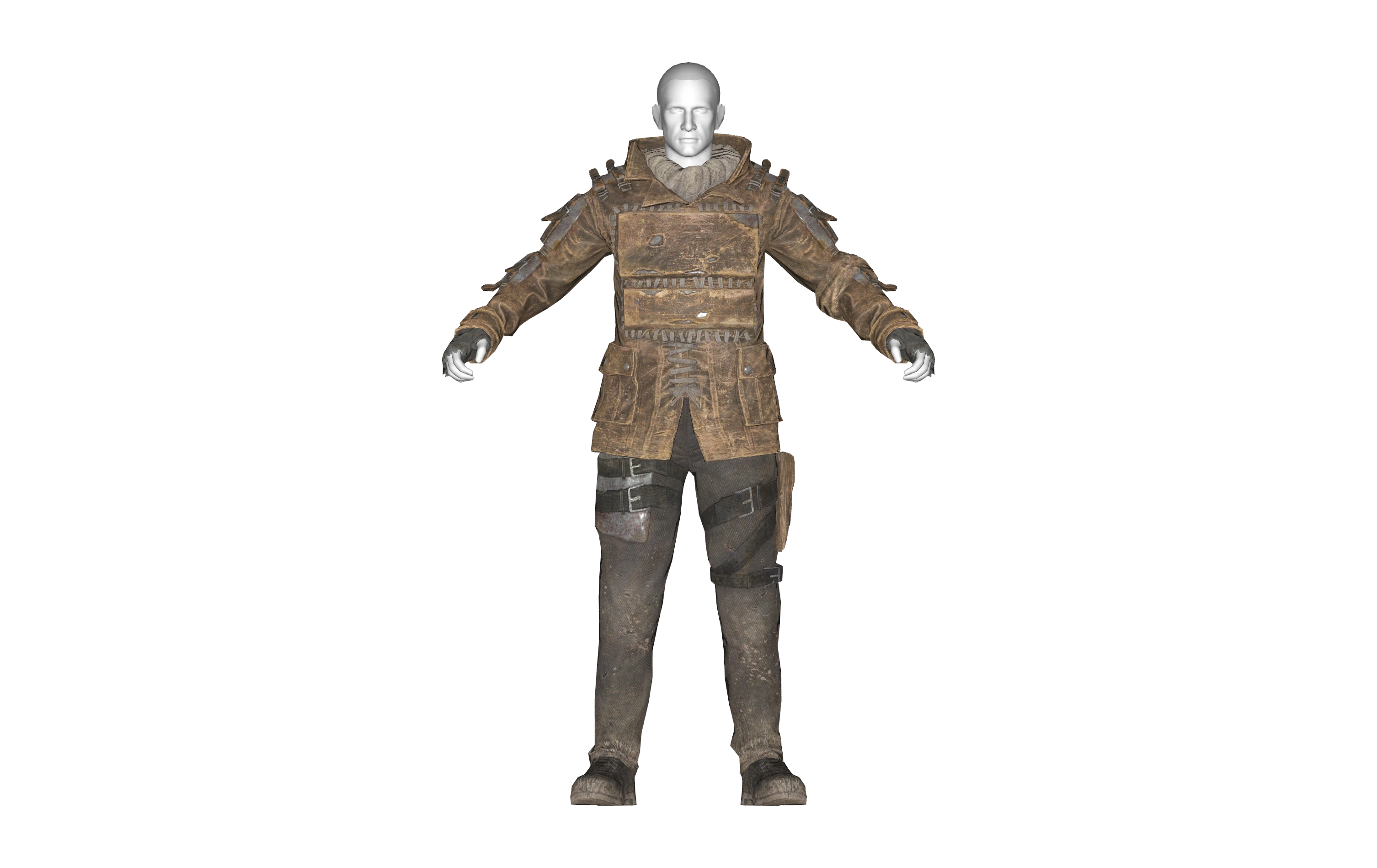 A heavy, protective garment designed for Railroad heavies, this massive suit of armor is crafted from a leather field jacket with multiple metal plates sewn on and attached using straps. Padding is provided by a thick sweater made of multiple layers of protective fabric. It's usually worn with a pair of rugged trousers with a thigh-mounted pistol holster and a pair of walking boots.