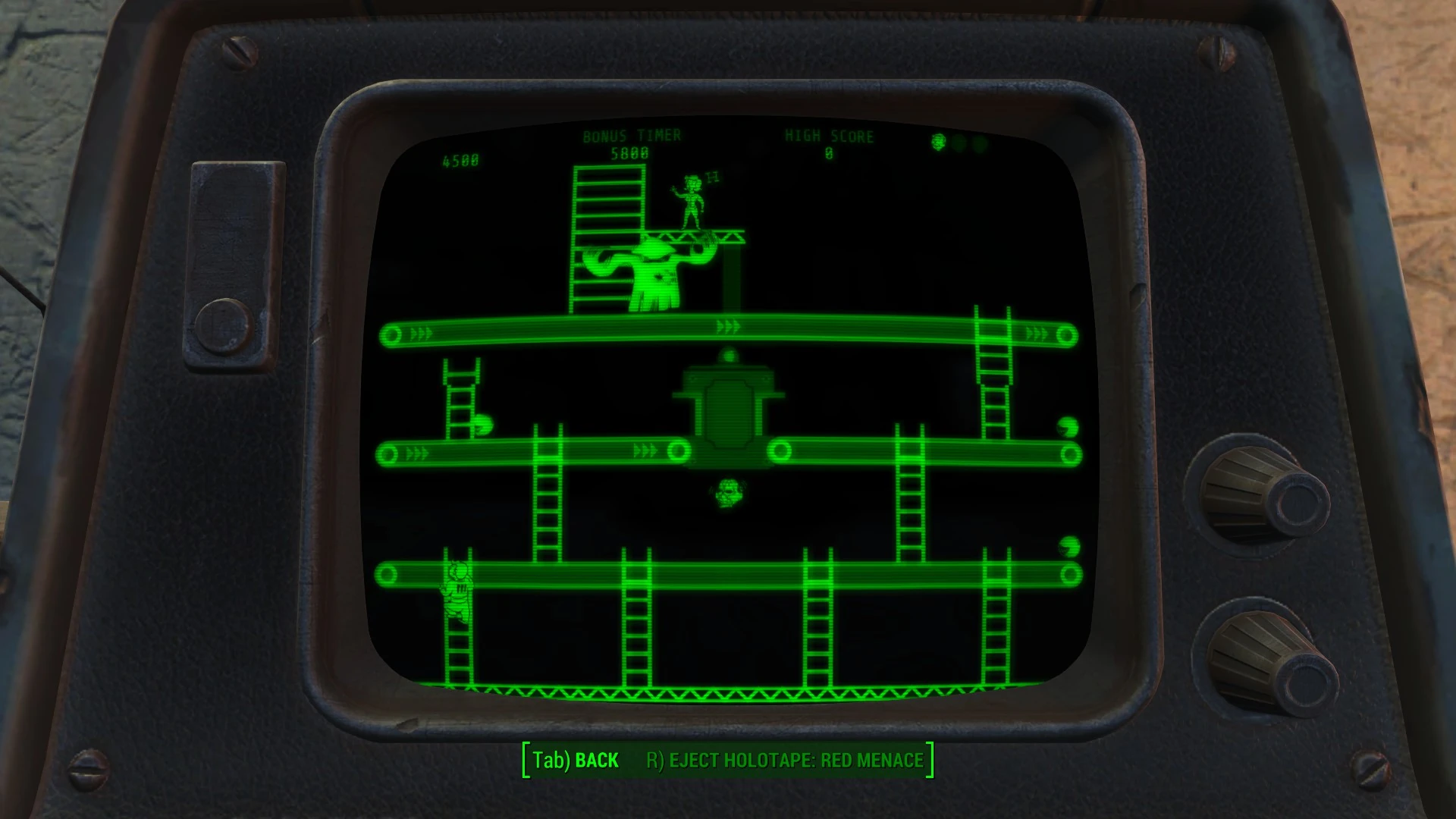 Published in 2075 by Vault-Tec Game Studios, Red Menace is a simple platform game playable on any device with a compatible holotape reader, such as the Pip-Boy 3000 Mark IV. The main goal of the game is to guide Vault Boy up a series of platforms to rescue Vault Girl while dodging atom bombs that the Red Menace throws from above.