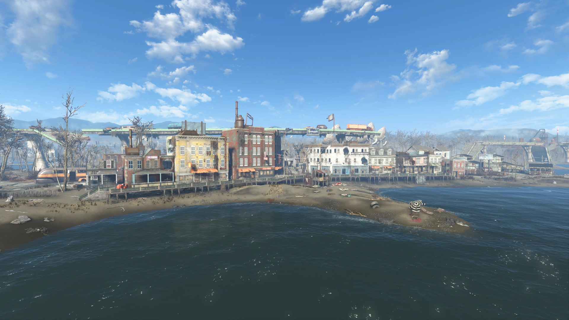 The boardwalk built along the shoreline has three main points of interest: the ice cream parlor, garage, and arcade. The ice cream parlor lies on the south side of the boardwalk and is a simple two story building with a counter out front. The garage is west of the ice cream parlor, across the street and requires walking up the fallen tree to get to the roof and dropping down. The garage contains a power armor station.