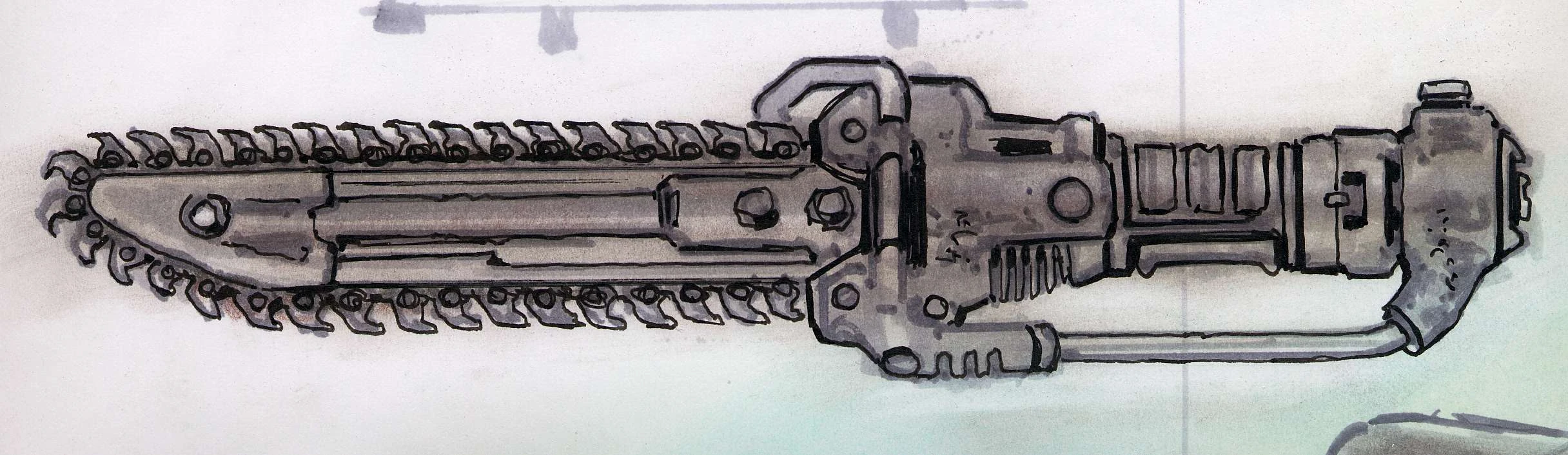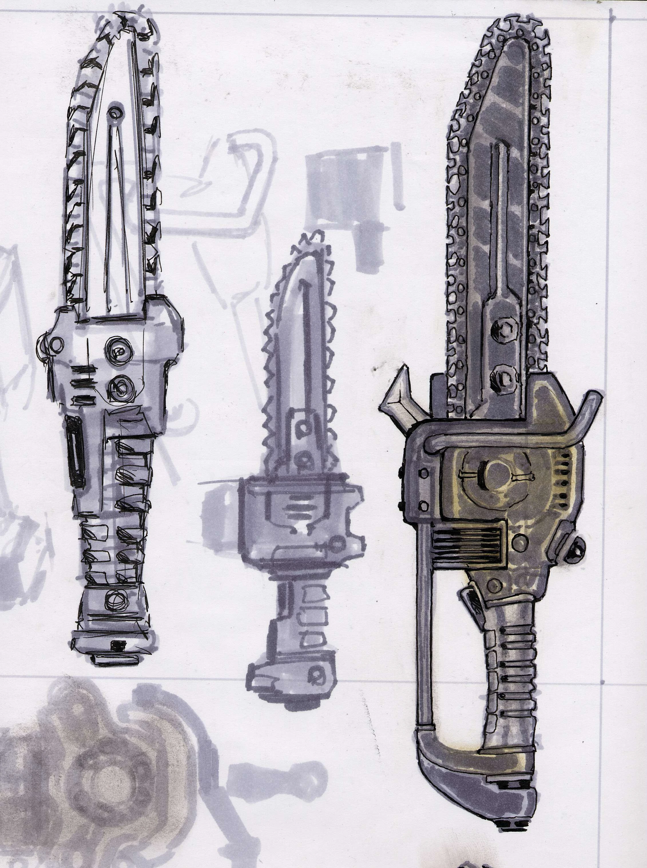 A hand-held, militarized chainsaw, popular with Army units requiring a compact engineering tool for cutting. Just what material is intended to be cut with the weapon remains open to debate. Two distinct models exist: A battery-powered variant with distinct teeth and pressurized gas-powered version using a chain.[5] A commercial-grade, scaled-down version was also made available for the general market.[6]