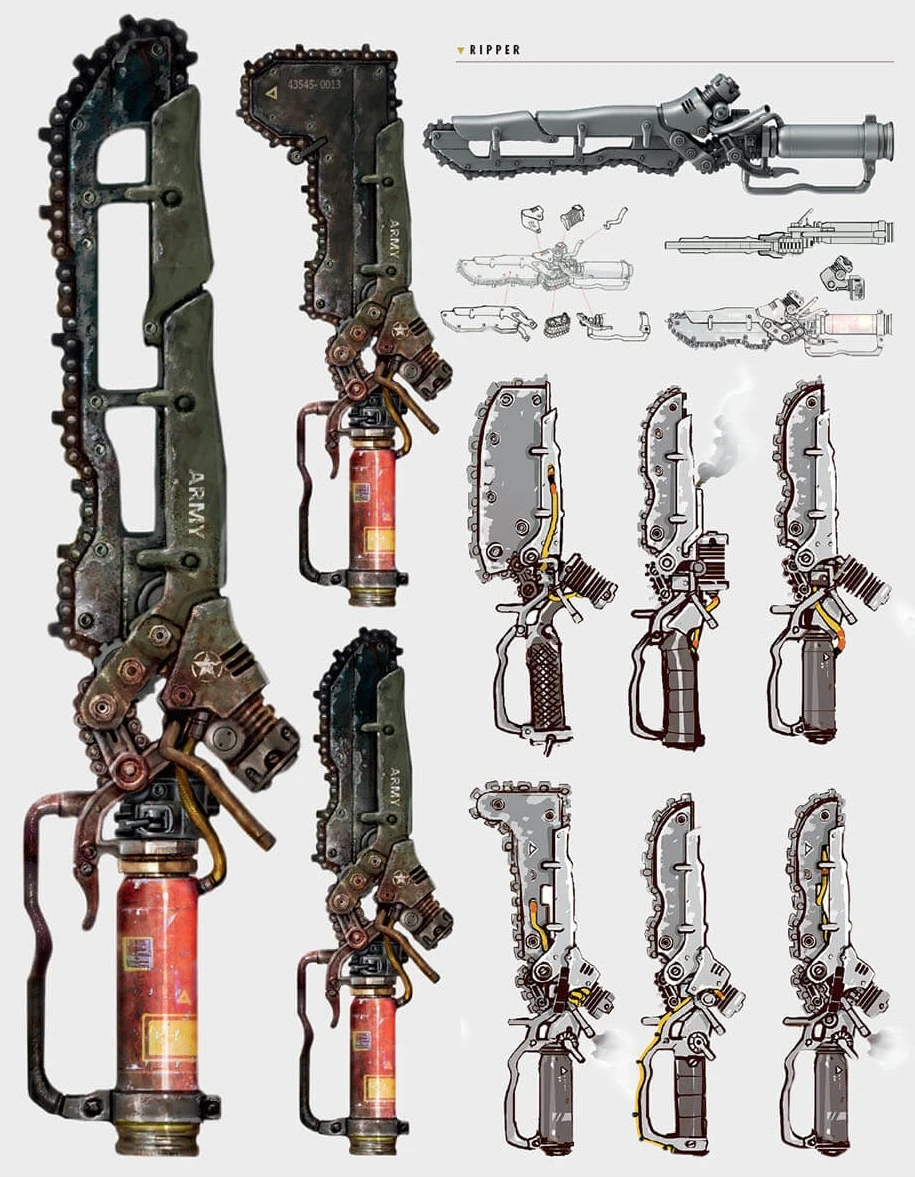 - ↑ Fallout 4 loading screen hints: "The Ripper is a small, handheld, militarized chainsaw that saw extensive use in the armed conflicts before the Great War."