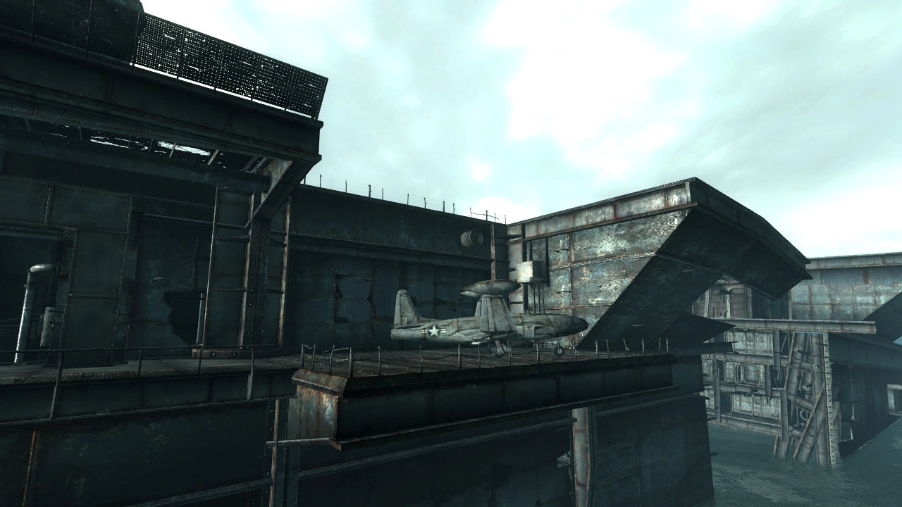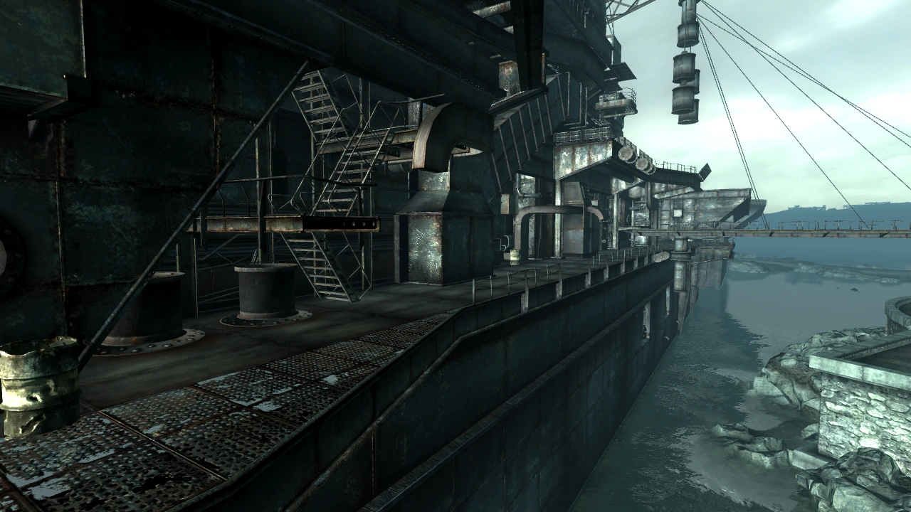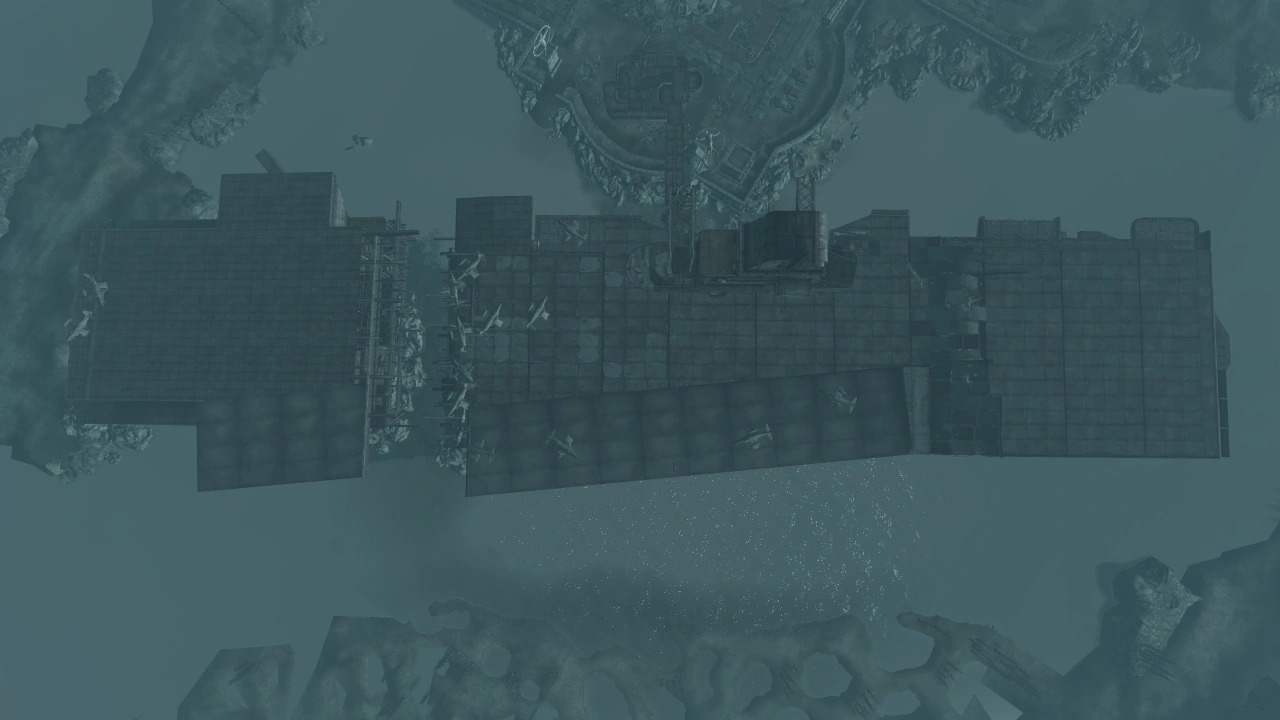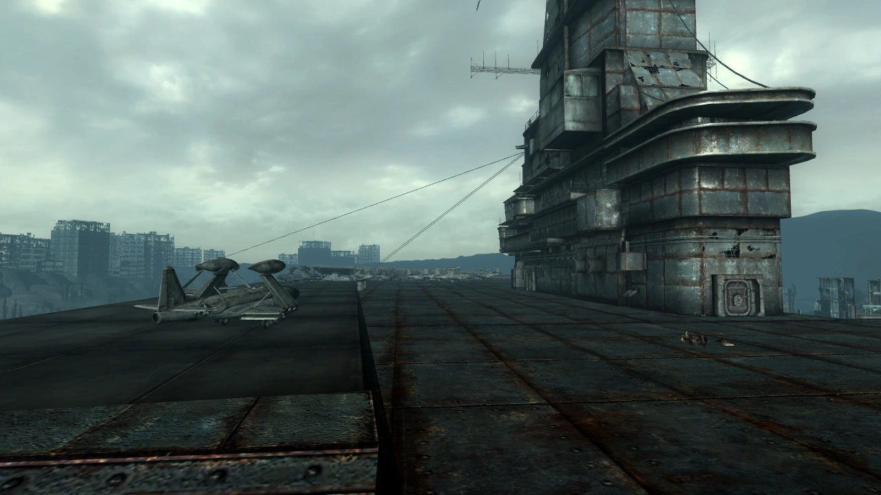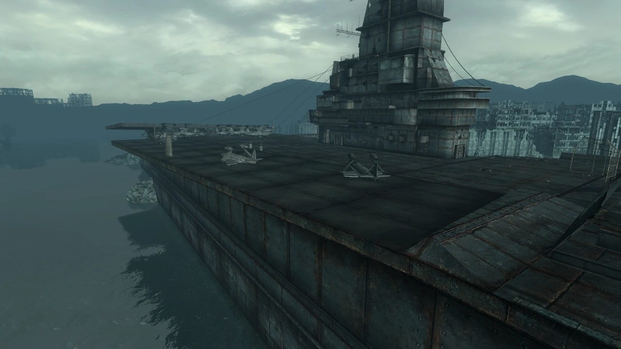 (Fallout 3 Game of the Year Edition Tour of the Capital Wasteland) - ↑ The ship's bow is embedded in the peninsula, with fighters scattered around; the only possible scenario is that the ship attempted to exit the port, but ended up driving into the peninsula, the resulting stress causing the bow to break apart. Furthermore, the damage to the built-up peninsula is only possible with plenty of force applied.