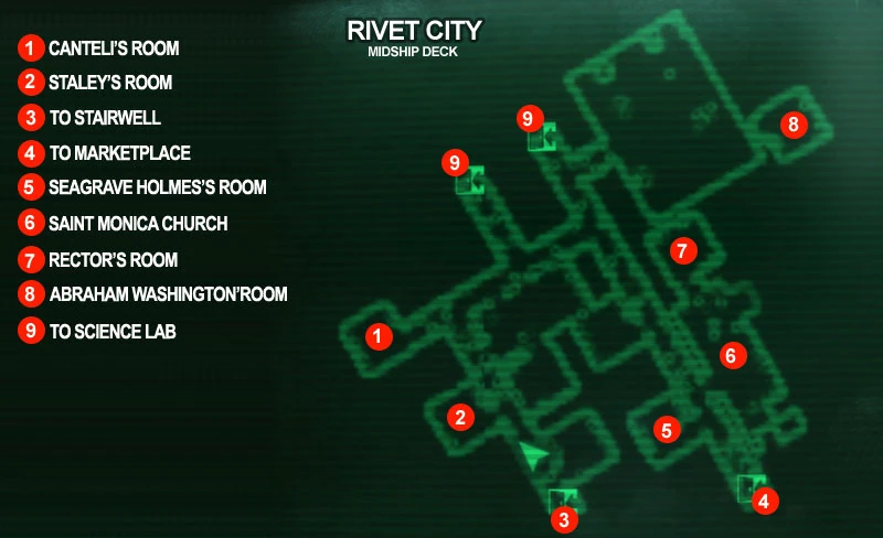 Rivet City is located in the south-eastern corner of the Capital Wasteland, near Jefferson Memorial and Anacostia. It is only accessible via a retractable bridge, connecting to a small steel platform erected on the shore (also inhabited by Carlos the beggar). Once Harkness clears the newcomer, they are granted access into the city proper. From the bridge gate one can access the Rivet City marketplace (purple), located in a converted aircraft hangar, and the stairwell, connecting the four main districts of the carrier.