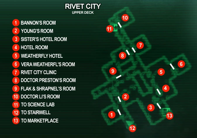 The city is divided roughly across the decks of the carrier, which make up the aforementioned districts. The topmost is the bridge tower (blue), sitting on the flight deck, which is the headquarters of the Rivet City police force and thus the military district. Below it lies the affluent upper deck (green), with the Weatherly Hotel.