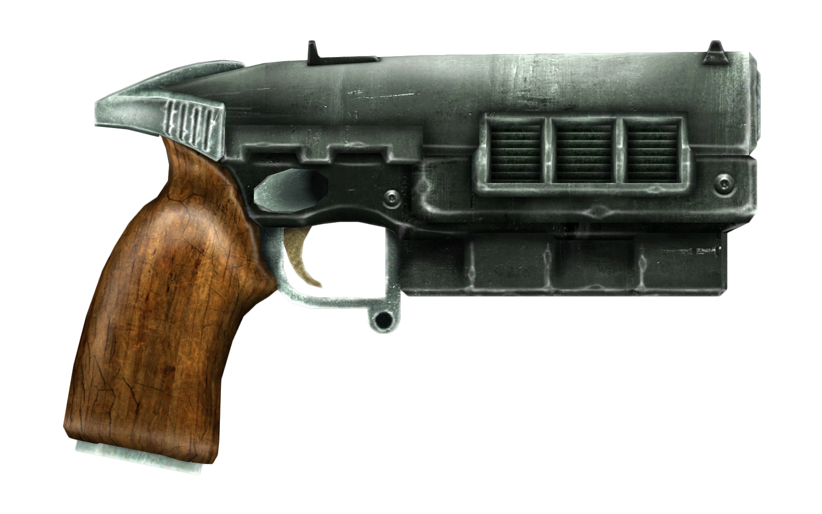 - ↑ Visually nearly identical to the 14mm pistol weapon from Fallout and Fallout 2.