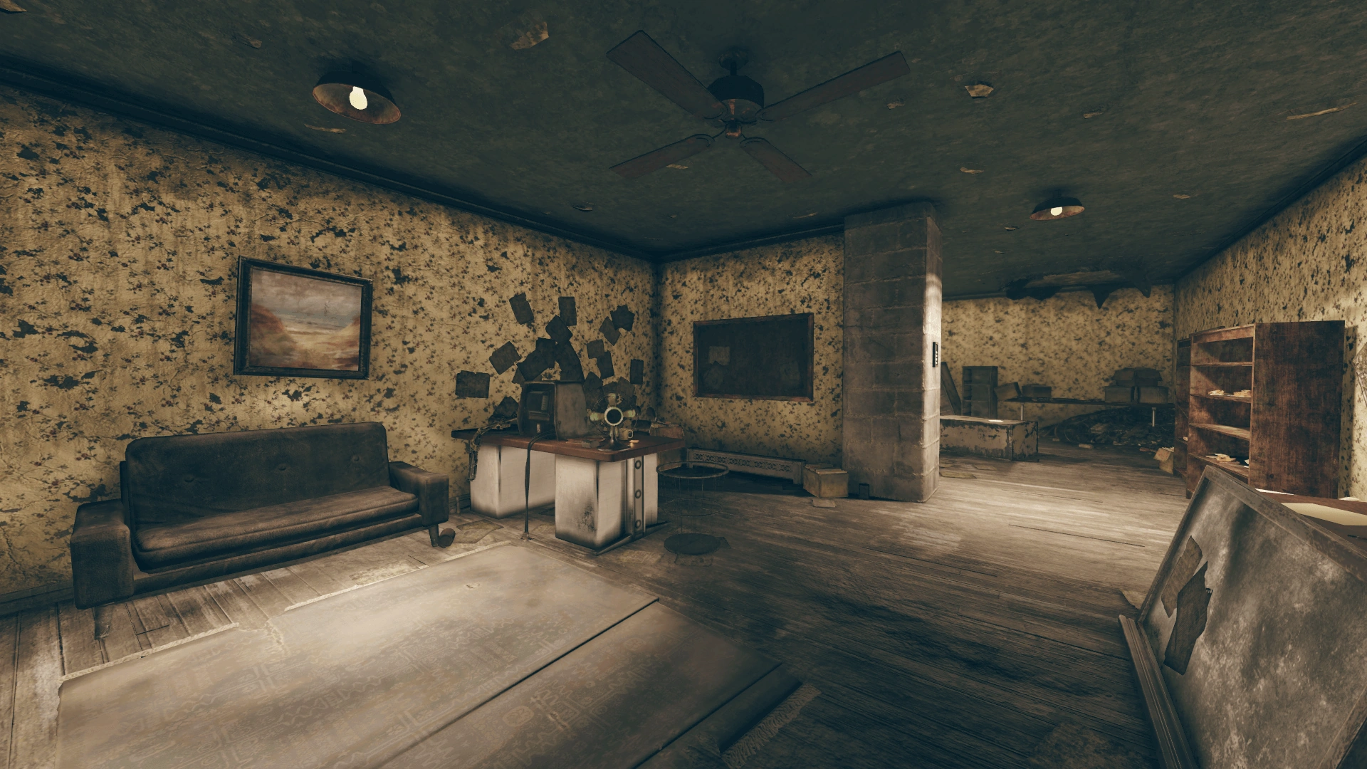 The bunker itself will still resist the player, denying access to the senator's inner sanctum at first. The bunker is divided into two floors, accessible from the entry chamber through the doors. The lower floor contains the main living areas, including a small workshop area, generator room, Sam's bedroom, laundry annex, and bathroom, all connected to the main living room and kitchen. In the back is a security checkpoint leading to the inner sanctum, protected by laser barriers. The upper floor contains Judith Blackwell's bedroom and a security station. The area is peppered with notes and reminders from Judy to her father or from Sam to himself.