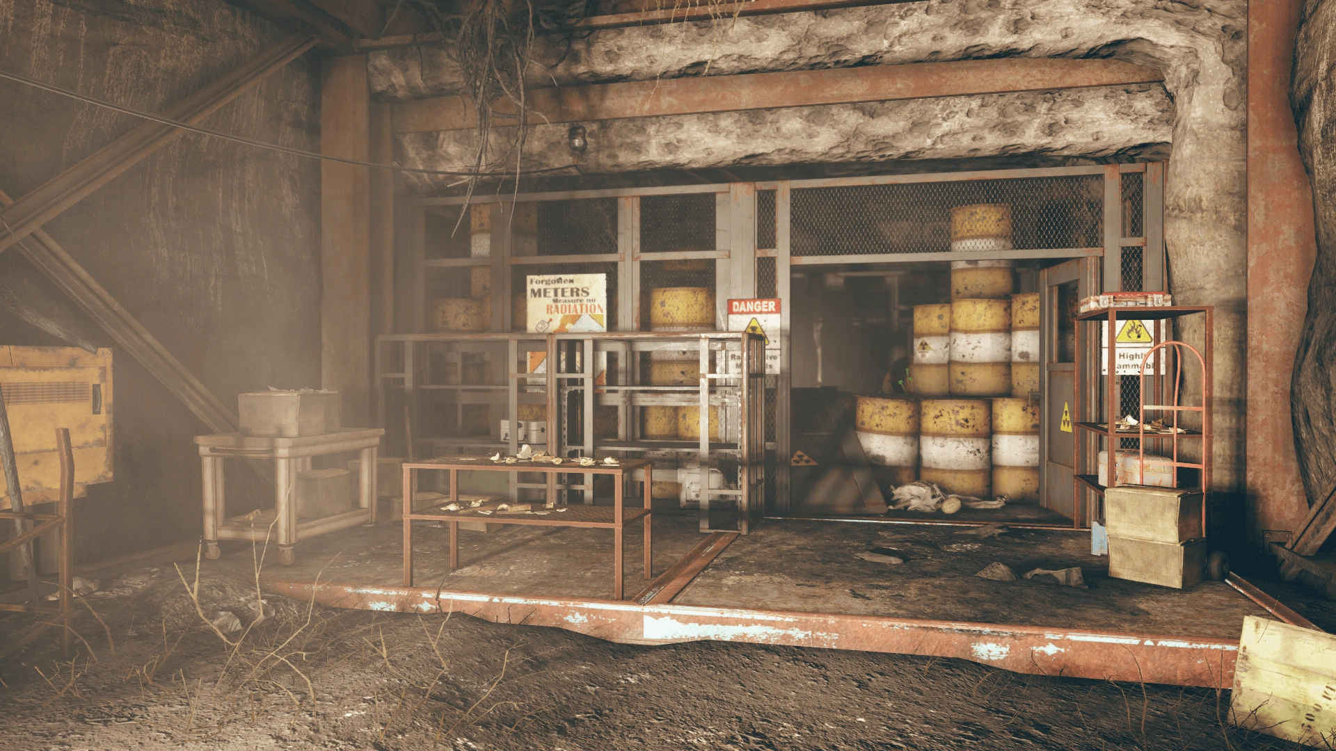 The bunker is hidden behind a completely innocuous map marker, the abandoned waste dump. After entering, the player is deposited inside what seems to be an illegal dump, complete with radioactive waste barrels and security fences. However, there is a conspicuous absence of radiation here. Beyond the doors ripped off their hinges is a small cave network, with a transportation system mounted to the roof of the cave... And deathclaws on the prowl. The Senator set up lures to provide himself with a supply of meat to survive, after he killed the operative in Harper's Ferry and swore off all contact with the outside.