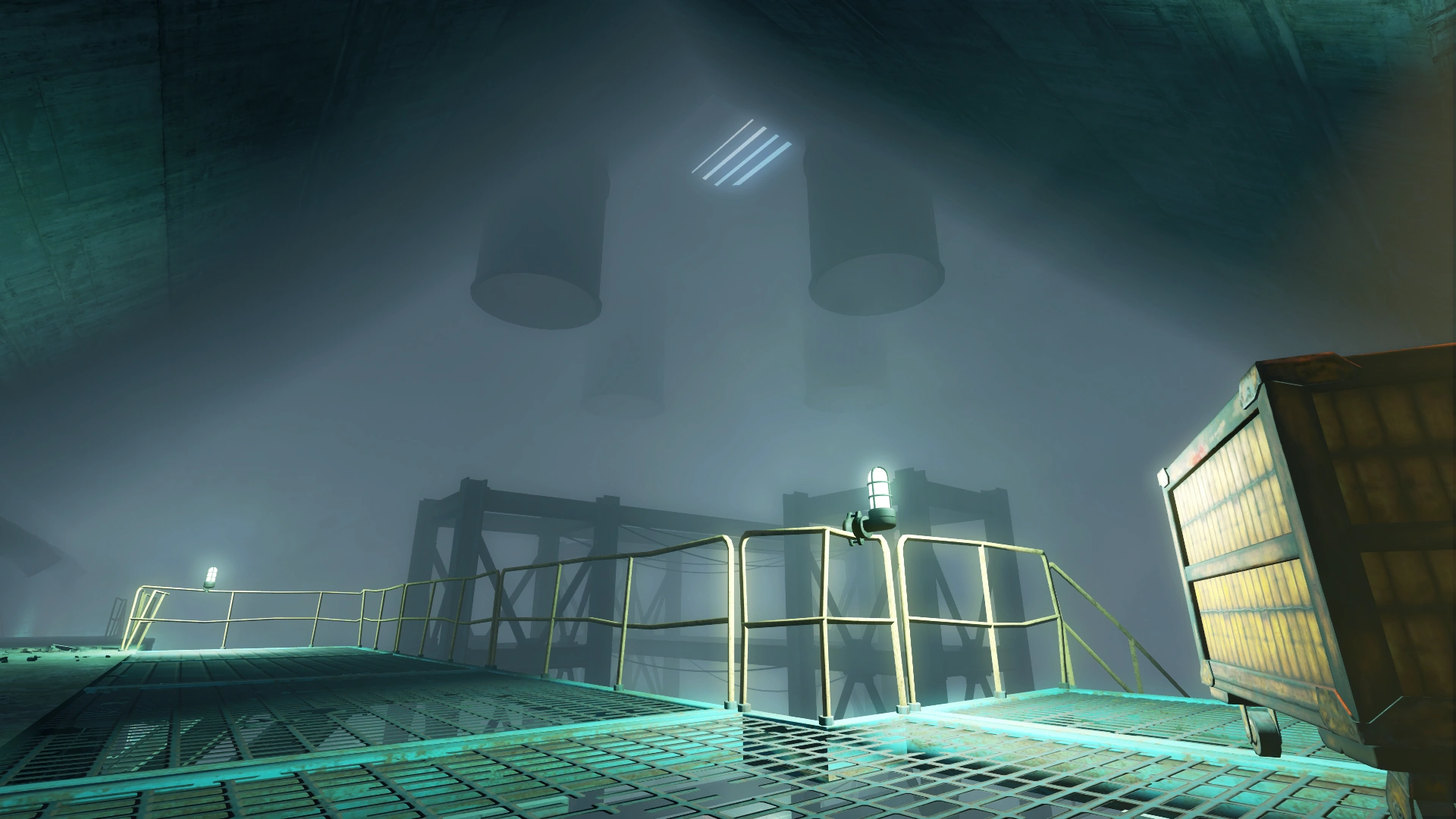The entrance of the pyramid structure opens to some catwalks on the other side of a security door. Down the stairs to the east is an multi-tiered control office, with another door leading down another catwalk to a launch booth room on the south side of the facility. A staircase leads down to the lower tier (which contains a chemistry station) and leads into a hallway that takes one lower to a control room containing a terminal that can abort the launch in progress and allows the blast doors throughout the facility to open. The room also contains an elevator that leads back upstairs and doorway that leads out to the launch pad.