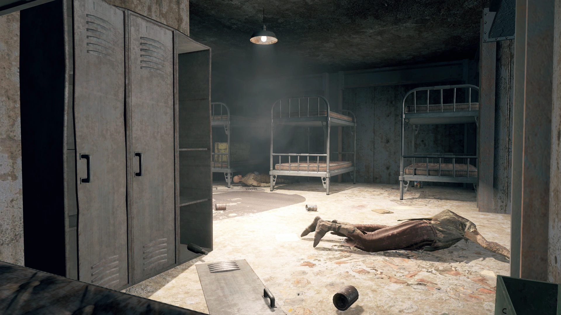 The launch pad has a lower area that leads east into a tunnel system infested with feral ghouls. The tunnel terminates at a collapsed section, forcing one into an adjacent hallway across from some barracks before proceeding down the tunnel again. The tunnel splits off after a short distance into a small storage room containing a few ghouls. The rest of the tunnel continues down further to a cargo bay; there is a cargo elevator that leads up to a secondary entrance is off to the side, but straight ahead is a control room containing Brother Henri and Atom's Wrath if Liberty Reprimed is active. The terminal in this room requires Henri's password to open and is able to open the locked red door in the loading dock, which is an expansive room filled with nuclear warheads; the room contains moderate to severe radiation, peaking at 28 rads per second near the back of the room.