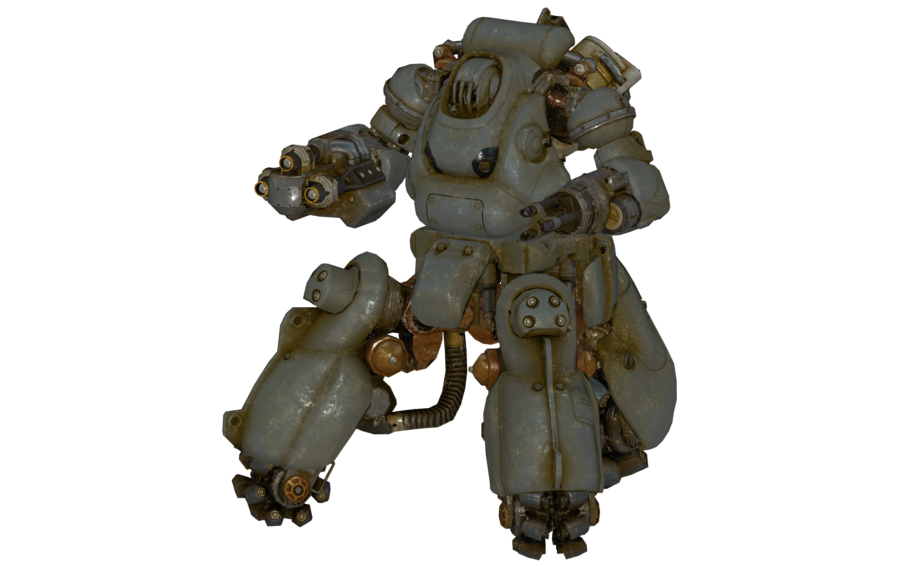The ultimate in high-end robotic engineering,[7] the next-generation sentry bot is the heaviest and most powerful pre-War military robot design that reached operational status. It contains of two distinct assembles. The upper body, protected by a rounded, cast armored shell, contains the primary systems of the sentry bot together with the fusion core sockets. A pair of large fans help cool down the torso assembly, while hinged flaps over the fusion cores allow for emergency venting if heat buildup reaches critical levels (its only major vulnerability).[8] The head is mounted at the front, on an articulated mount that offers a degree of mobility, and typically protected by an additional level of armor. The arms act as hardpoints, accepting a variety of loadouts including a tri-barrel minigun and a triple-shot missile launcher. An additional hardpoint is installed on the back of the sentry bot, allowing for a pair of cluster grenade launchers.[9]