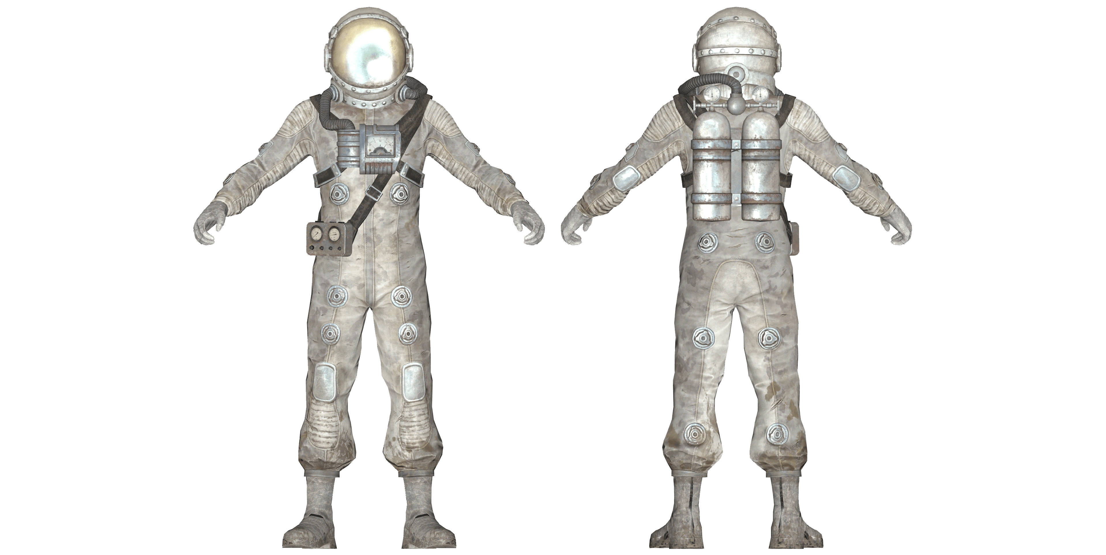 The space suit costume offers 50 energy resistance, 15 radiation resistance and 5 ballistic damage resistance. These suits are also quest items for Trip to the Stars and cannot be removed until the quest is completed. They offer no modifications.