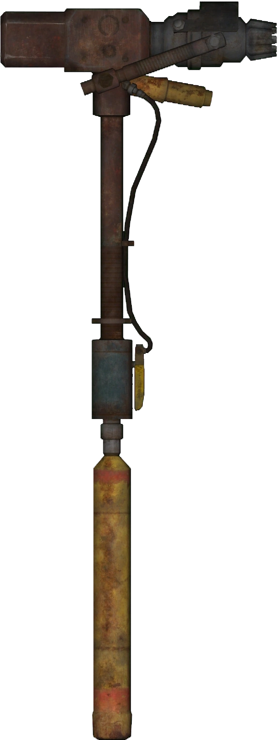 This pre-War model was originally used by construction crews for demolition. Fitted with a rocket booster at the head, the sledgehammer would behave like a normal tool until it reached a certain acceleration point, when the booster would activate and deliver a tremendously powerful impact, easily crushing concrete. Of course, its use required carefully selecting the target area and trajectory, as while the operator was protected from the recoil by the shock dampener in the handle, everyone around them was vulnerable. Of course, it certainly didn't take much imagination to find alternative uses for the existing units after societal collapse.[1]
