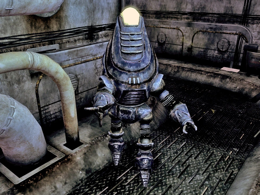 The Custodian is a unique protectron found in the Big MT west tunnel, along with some leveled MK series protectrons. The Custodian is the automated janitor for the train tunnel (complete with dust mop) and perhaps the train system itself. However, after Elijah wrecked the train system, it and the other protectrons became trapped inside.