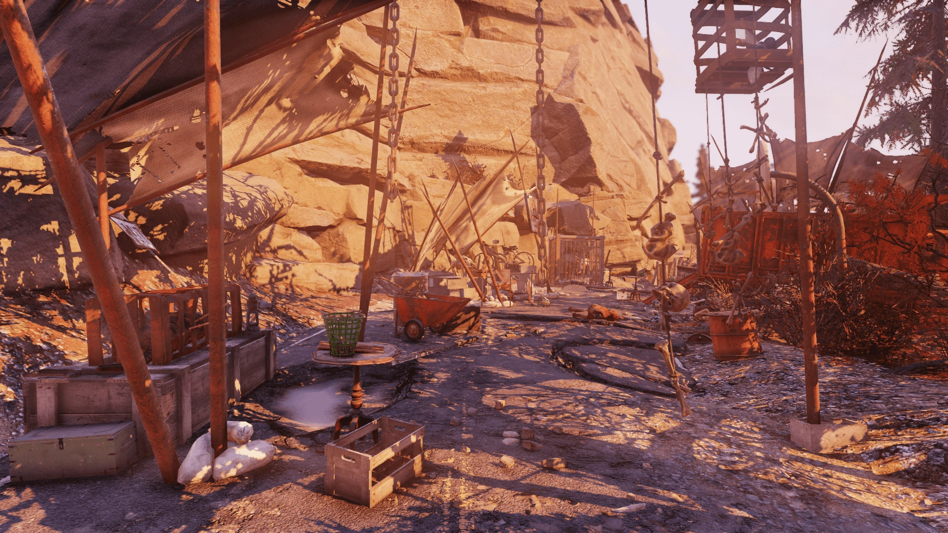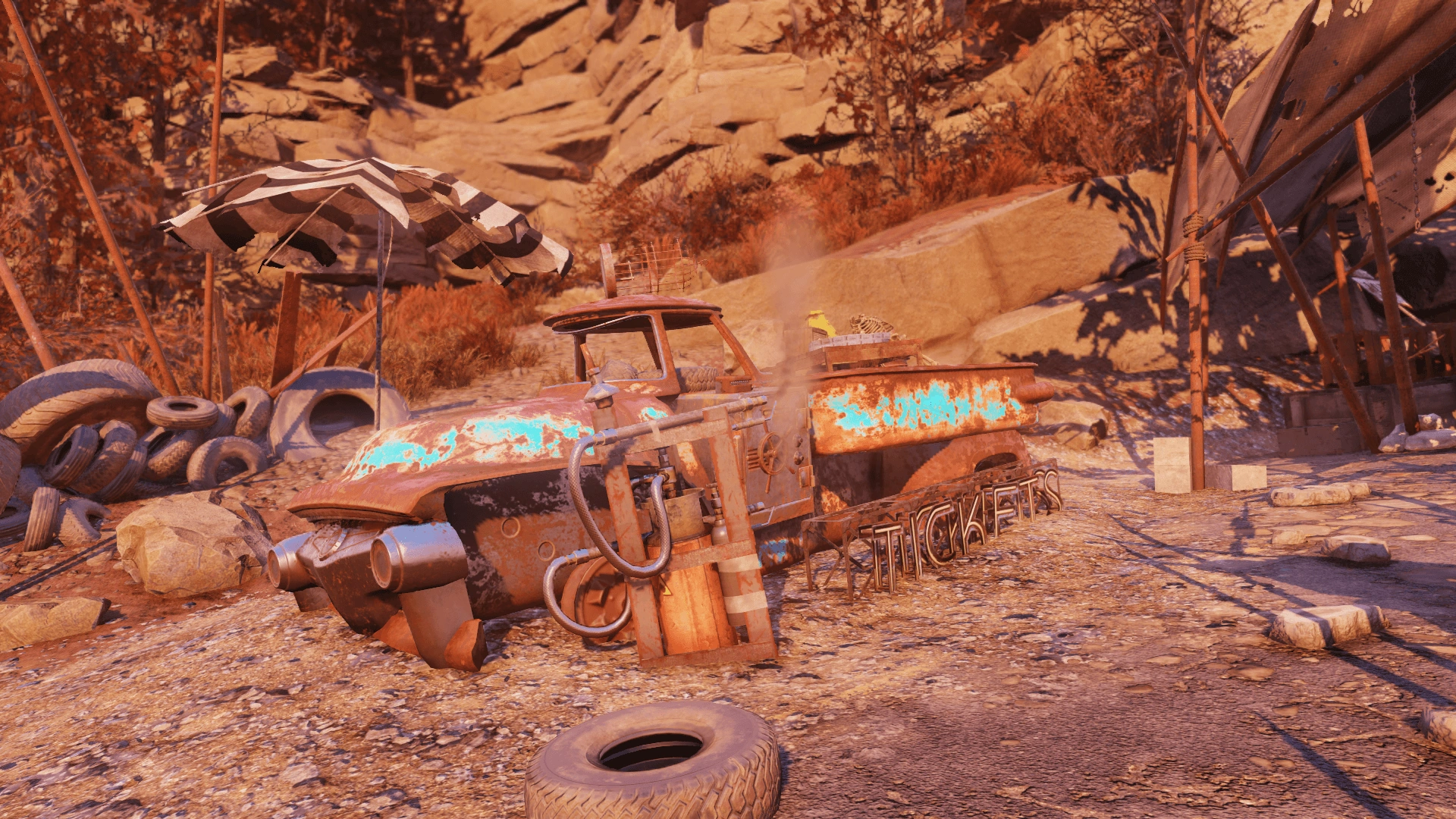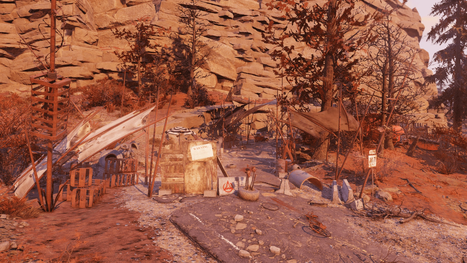 - The small outpost stretches alongside Route 107 and is effectively a raider carnival. The southern end has the ticket booth with a safe, a caps stash, and a roll of tickets in an old truck, while the cages further inside contain numerous dead mutants. The bowling sections includes a pair of rad stags, always good for their meat. Mind the traps, however, as the place includes a flamethrower, bone chimes, and several mines.