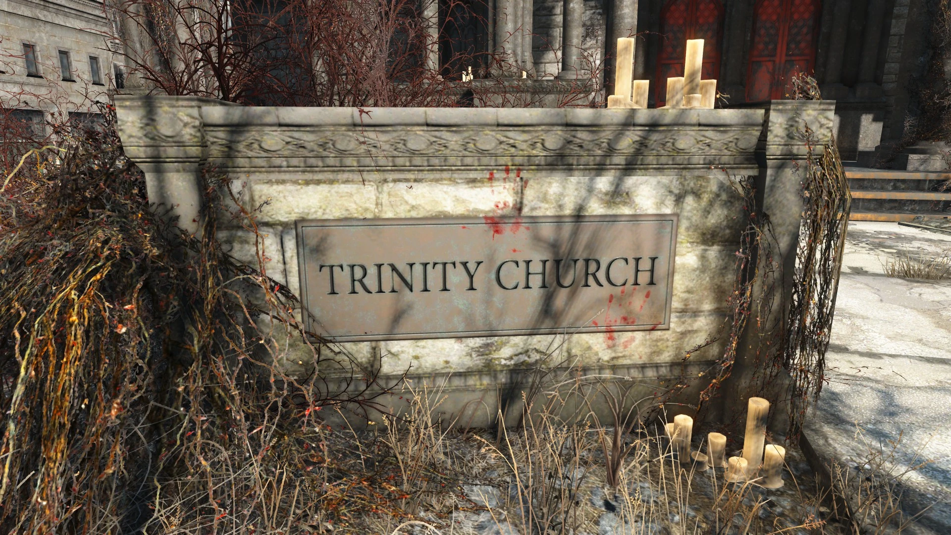 Still standing in the overgrown plaza that bears its name is Trinity Church. Founded in 1733, the present structure was completed in 1877 and now houses a small congregation of Super Mutants. The church has two entrances—the main doors and a hatch to the rear (east). Don’t forget the magazine from the pulpit. The area is easy to spot from a distance; it is adjacent to the massive Trinity Tower."