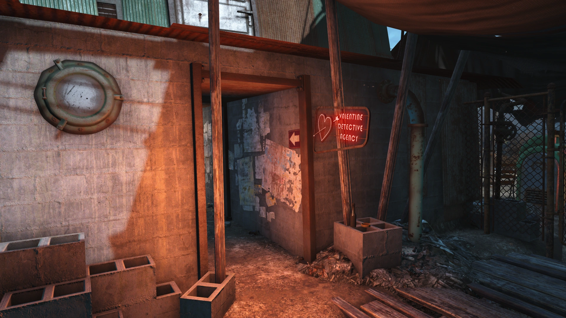 Valentine's agency is a relatively small building that consists of one large room, with a small doorway that leads into the sleeping area, as well as 2nd floor that consists of an exit door that leads back out into Diamond City.