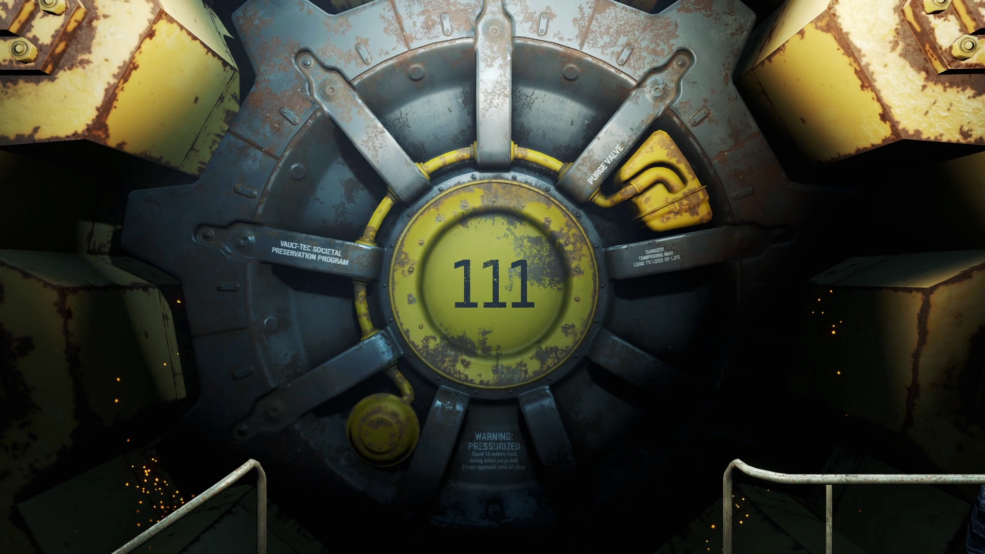 The latest, fortified airlocks seen only in high-tech areas such as the Commonwealth further iterate on the system. The Vault door connects to a retractable catwalk leading into the Vault, monitored by Vault security and personnel during processing. The entrance area, painted in warm colors with a reassuring corporate slogan prominently displayed (Welcome Home), would typically include a security station and an array of radiation scanners that would analyze people entering the Vault proper.[78]