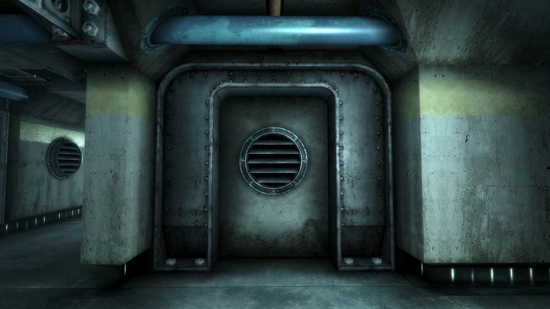 Several layouts were developed for entrance areas. The earliest Vault designs, derived from the demonstration Vault,[75] had a simple airlock, terminating in a security door fitted with additional armored plating to deter attackers and protect against radiation. This airlock would typically contain a status terminal and a locker for emergency supplies.[76]