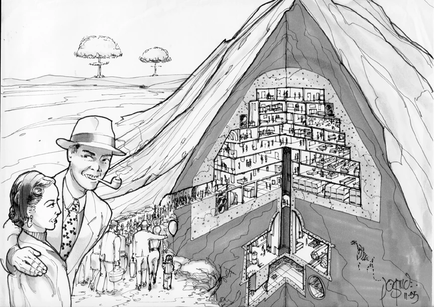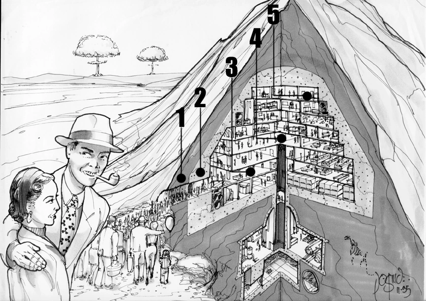A schematic of a common Vault design used in mountainous areas. 1 - Natural bedrock 2 - Reinforced concrete that creates the outer shell of a Vault 3 - Entrance area 4 - Living quarters 5 - Command center