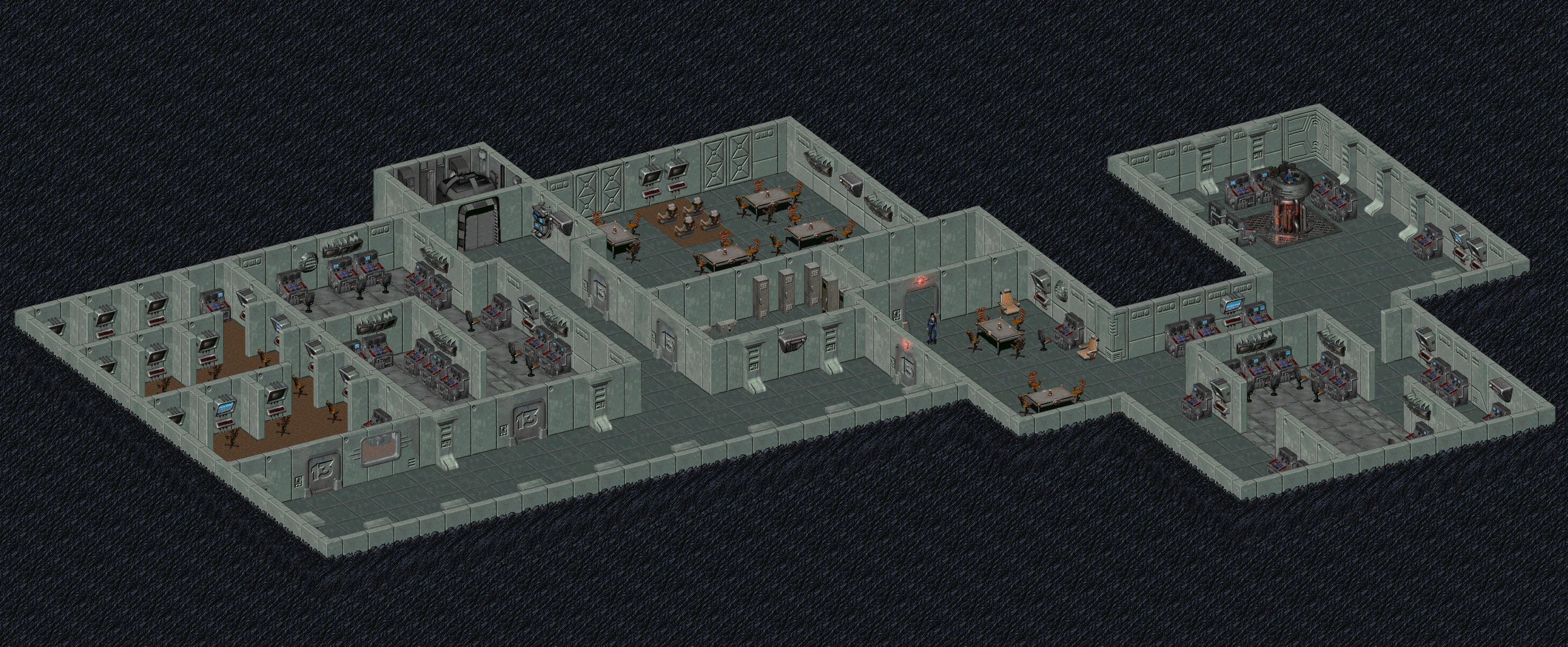 The command center is the nexus of Vault activity, where all the computers necessary to maintain the Vault's various functions. Centered around the Overseer's office, it typically incorporates the security station, armory, computer core, meeting room, and library, although many variations of the layout have been developed.[85]