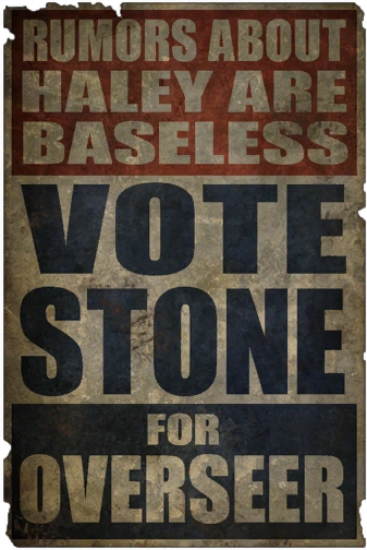 The entire vault has been plastered with propaganda for an election for a new Overseer, but each candidate is expressing outrage at having been nominated and trying to point out not only their innocence but why the other candidates deserve to be Overseer for their sins. Deeper in the vault, sandbag barricades and traps indicate that there has been armed fighting at some point.